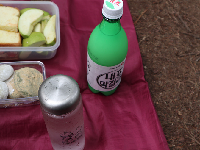 식빵(햄 채소) 사과 찹쌀떡 쑥콩떡 막걸리(중식은 아닙니다... 간식)