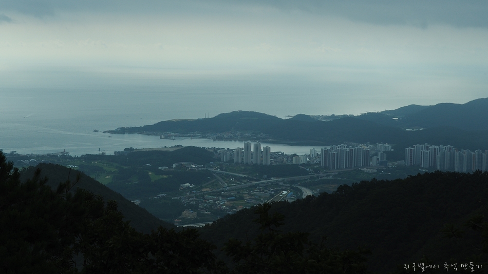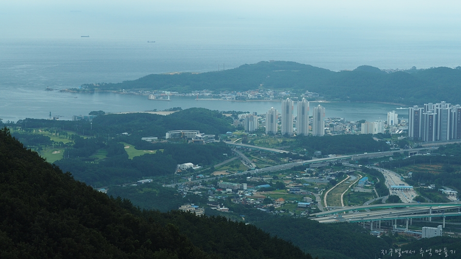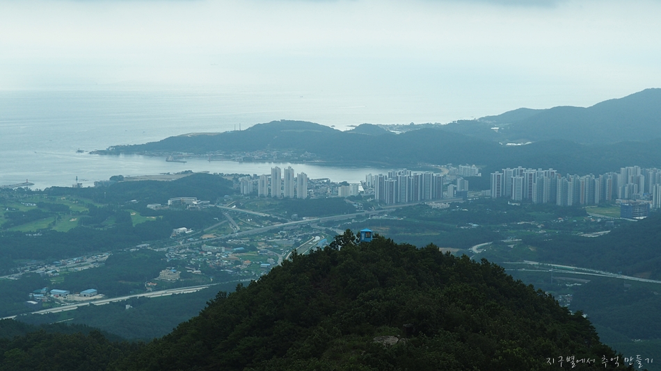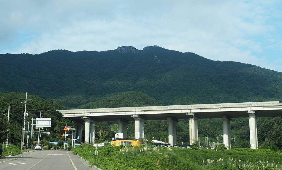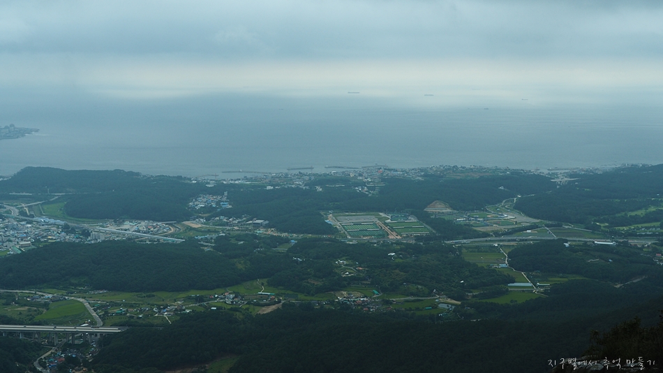 그 앞을 지나가는 부산~울산 고속도로가 보이고 뒷편에 우뚝 솟은 산이 달음산입니다.