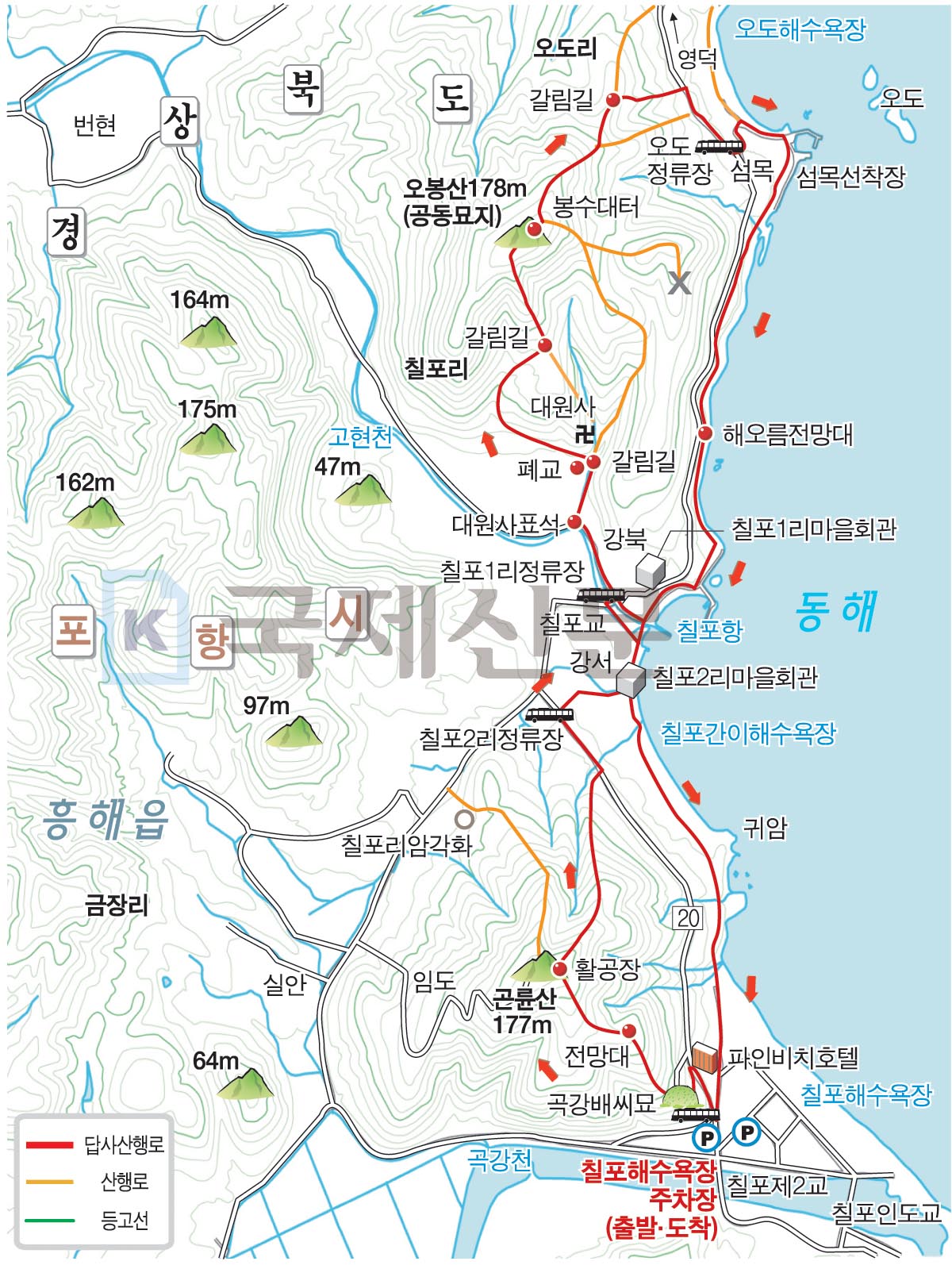 산행 코스 : 칠포해수욕장 주차장 - 곤륜산 - 칠포1리마을 - 해파랑길 - 칠포해수욕장 주차장(원점회귀)