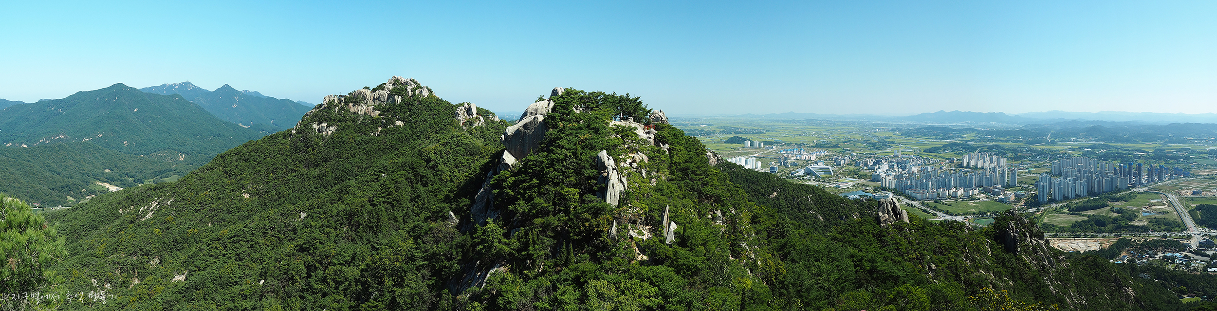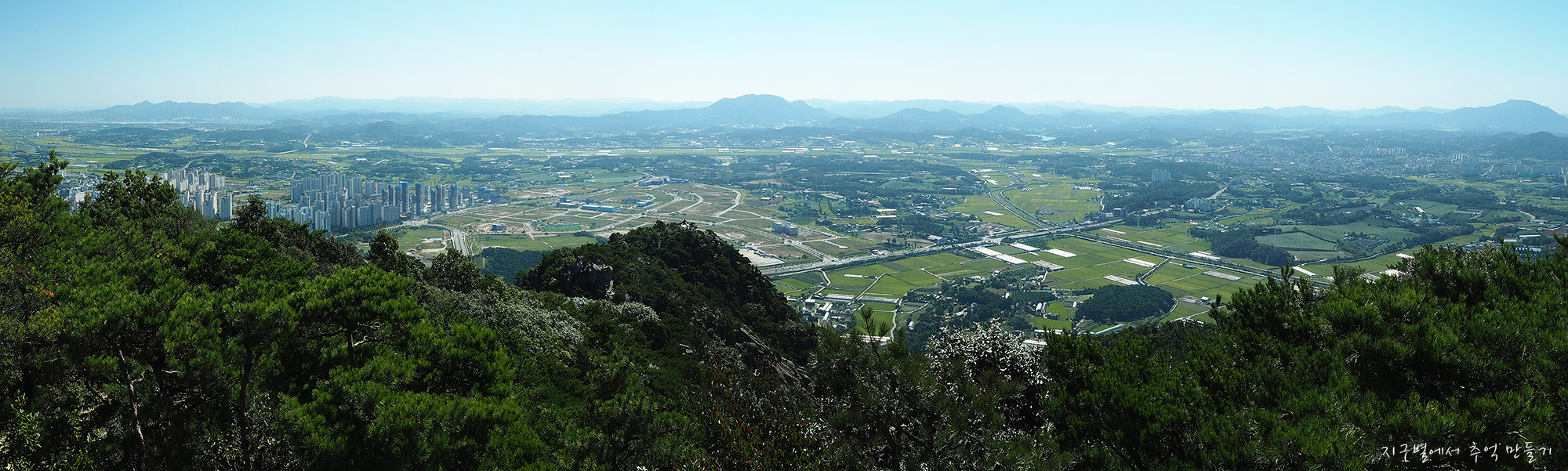 뒷편 가야산과 악귀봉 노적봉, 그리고 내포신도시를 연결하는 파노라마.