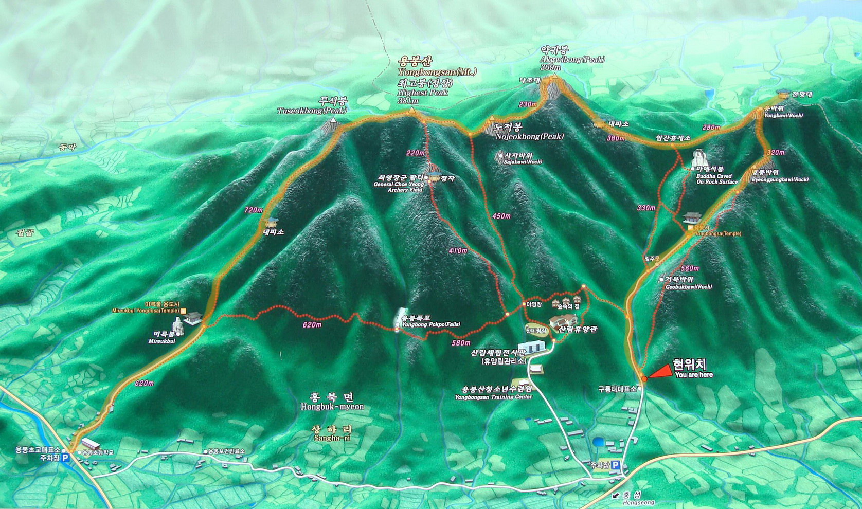 좌측 용봉초등학교를 들머리로 하여 능선에 오른 다음 전망대가 있는 용바위까지 가서 병풍바위로 하산을 하였답니다.