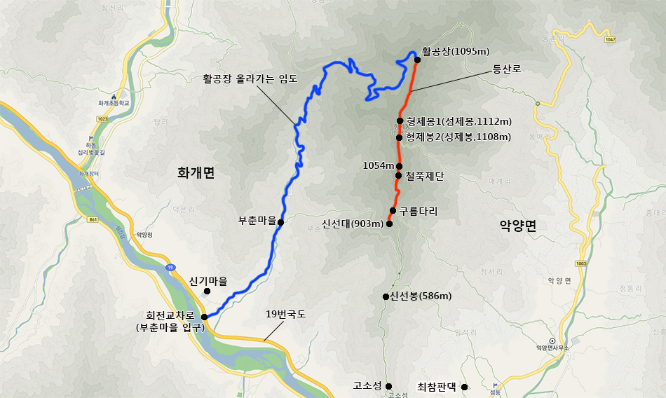 파란선은 활공장 오르는 차도인데 거의 임도이고, 빨강색은 산행 코스로서 활공장에서 신선대까지 내려 갔다가 올라오는 특이한 형태입니다.