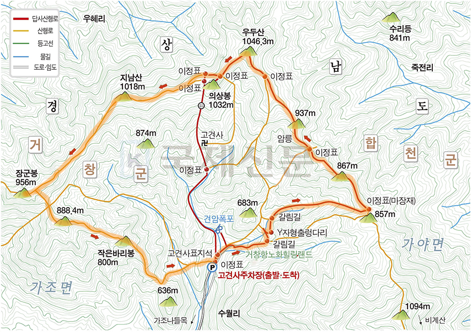 산행 코스 : 고견사 주차장 - Y다리 - 마장재 - 우두산 정상 - 의상봉 - 지남산 - 장군봉 - 바리봉 - 주차장(원점회귀)