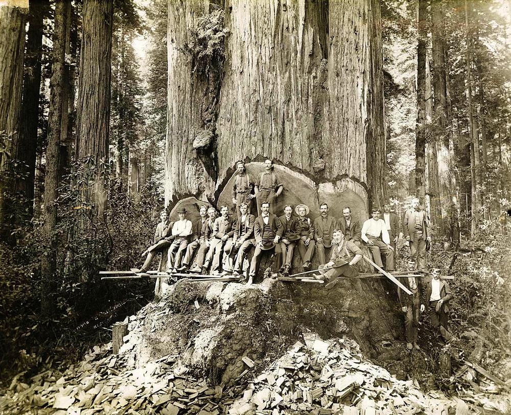 12. 캘리포니아의 거대한 레드우드 나무를 베어내다가 휴식을 취하고 있는 1900년대의 벌목꾼.