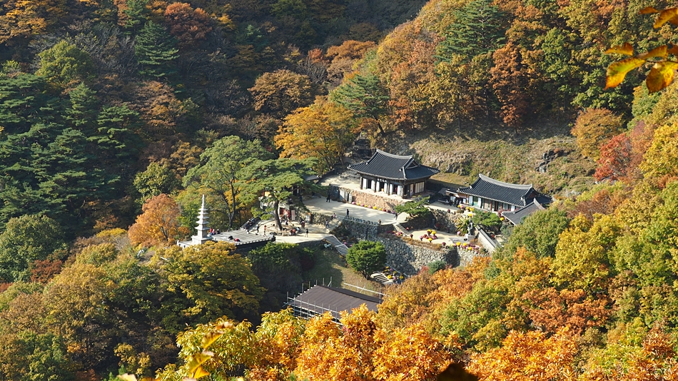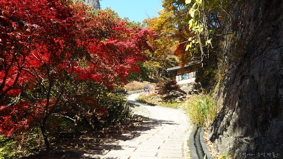 절집은 잘 꾸민 미술관처럼 보이고 골과 능을 물든인 단풍이 절을 빨갛게 불 태우고 있네요.
