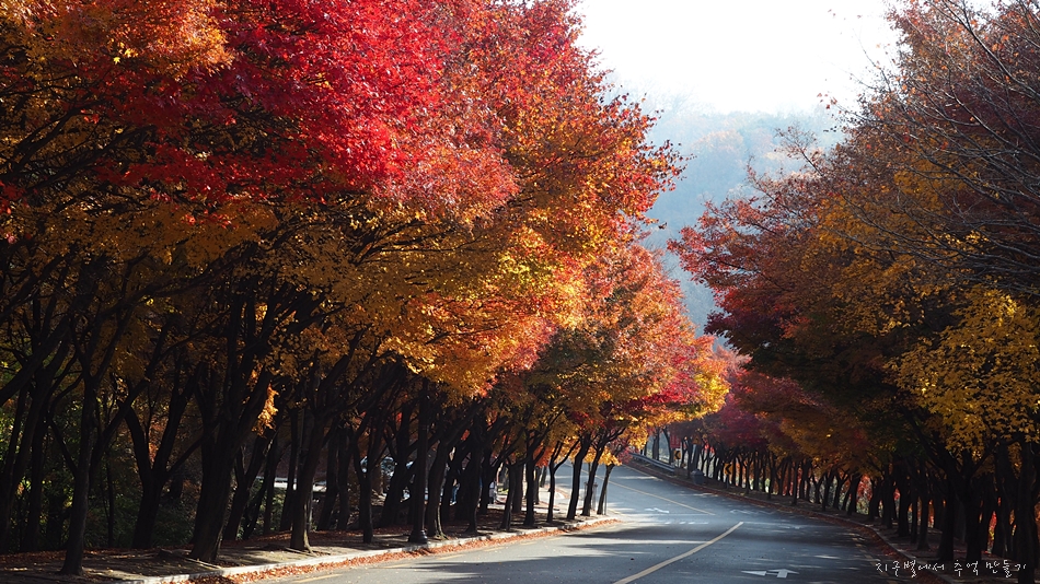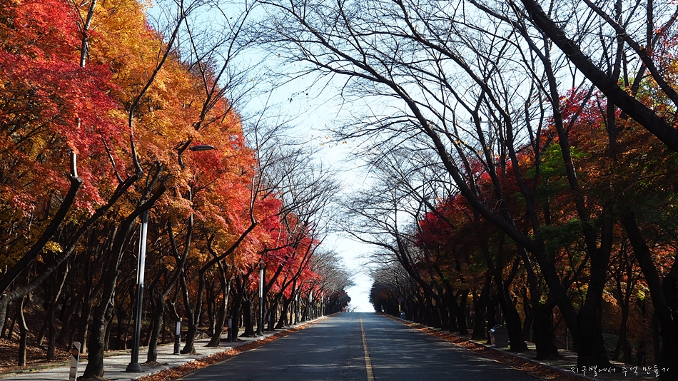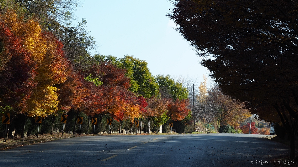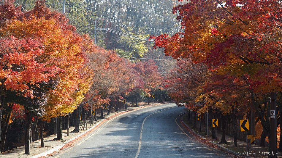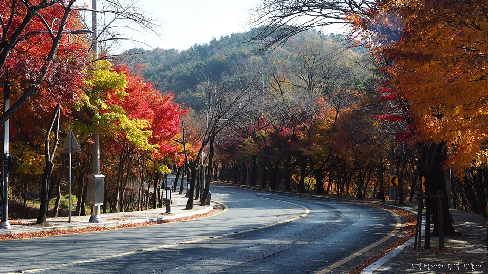 도로 가장자리에 밀려서 쌓인 빨간 이파리들이 또 한 계절의 지나감을 알려주고 있네요.