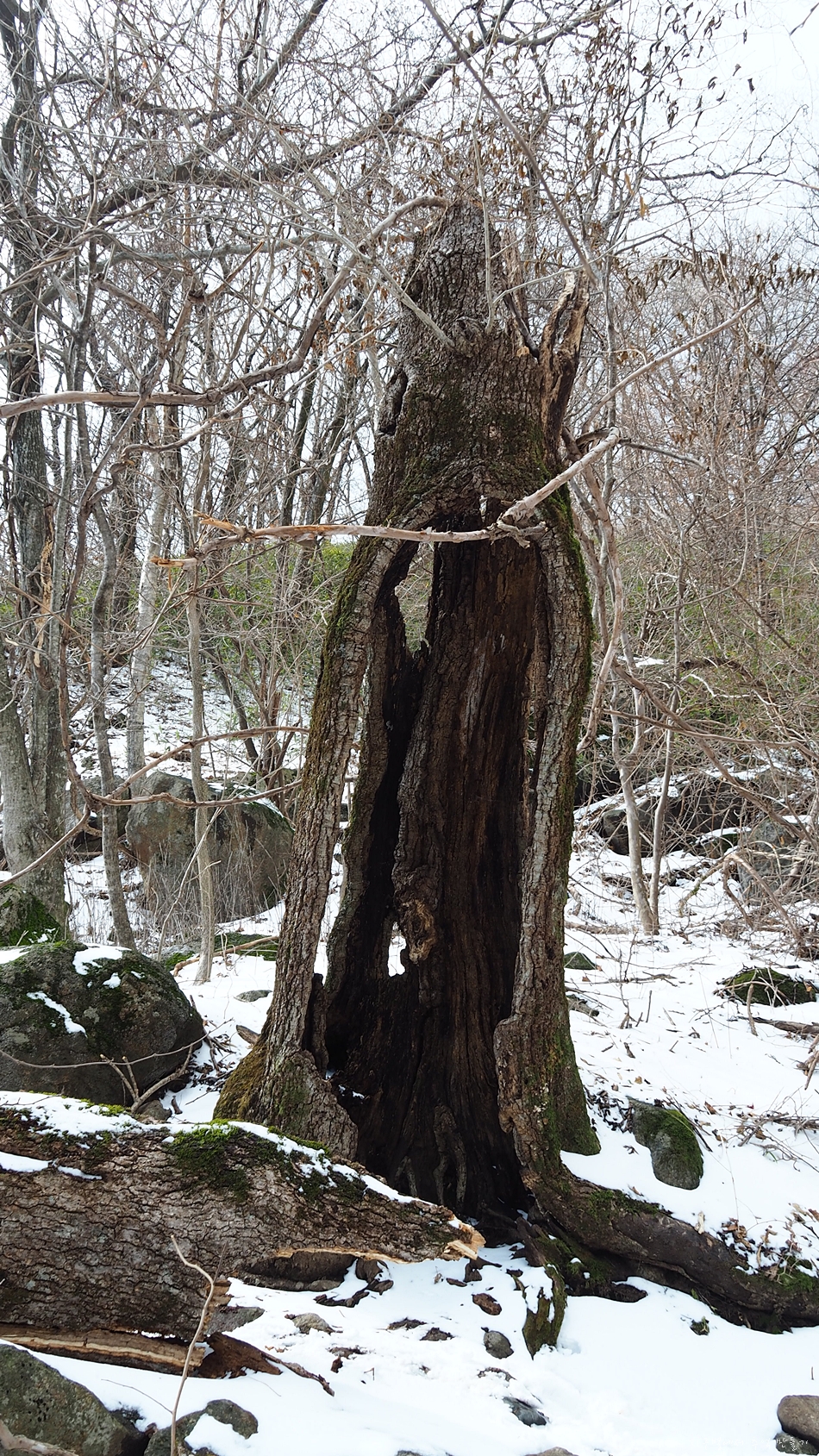 속이 텅 비었던 이 나무는 결국 윗 부분이 넘어가 버렸네요.