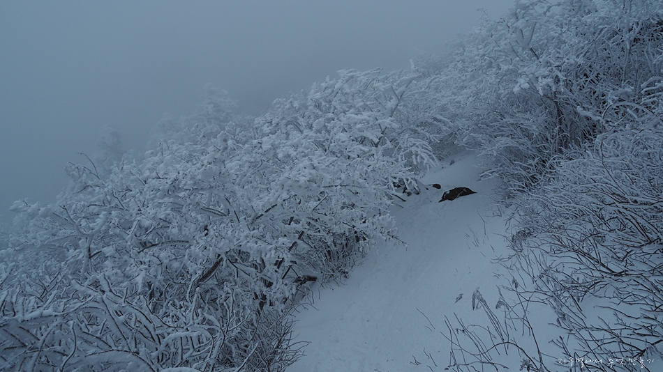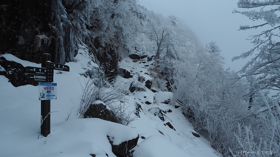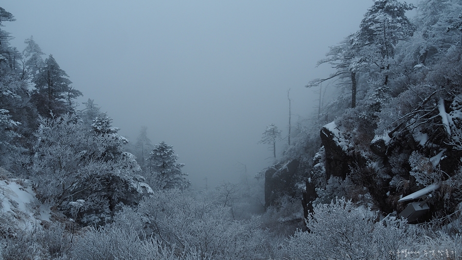 칼바위 출렁다리 지날 때까지만 하여도 발자국 날 정도의 눈길이었지만 법계사 지나고부터는 귀신 울음같은 바람 소리 곁들인 한겨울이었습니다.