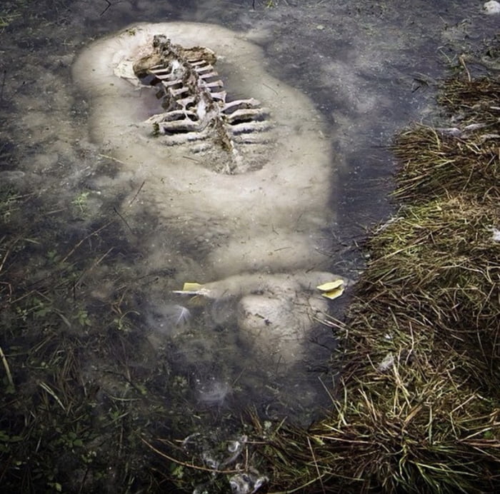 17. 덴마크의 한 운하에 빠져 익사한 양이 얼어 있고, 등 일부는 튀어나와 노출되어진 곳을 새들이 먹어치운 장면입니다.