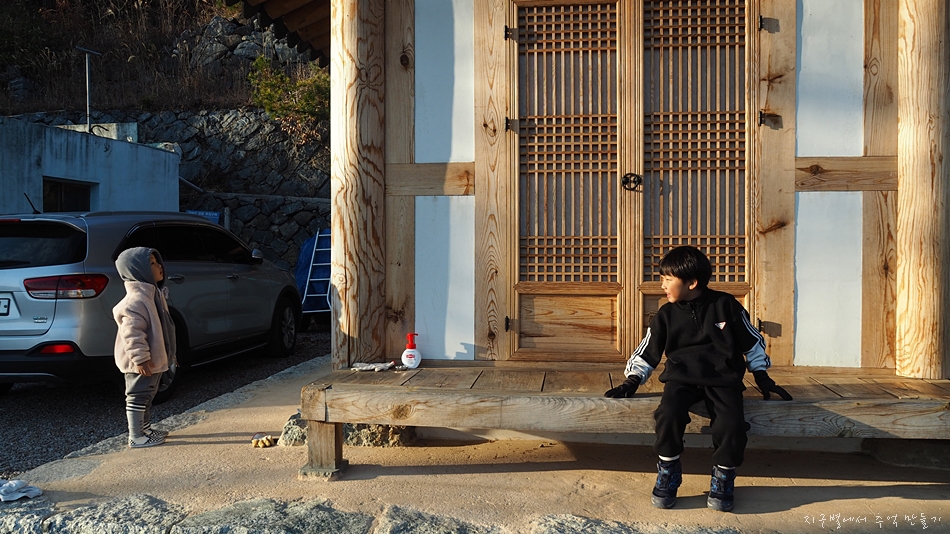 쫴맨한 아이 세명이 소란스럽게 들이닥치는데도 꼬리만 흔드는 무덤덤한 견공 보살