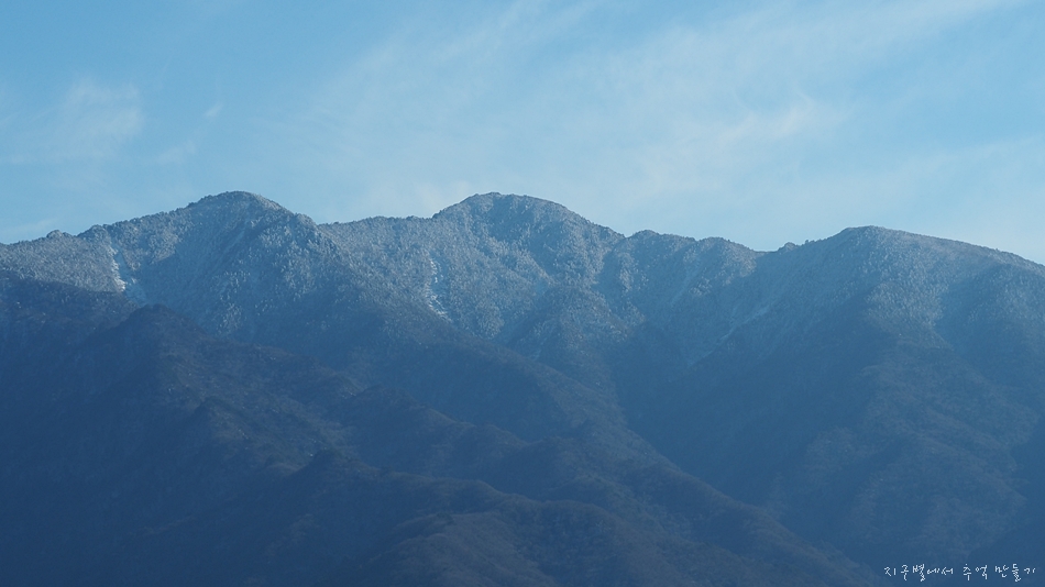 눈 덮인 봉우리 중 우측이 천왕봉, 좌측으로 중봉과 하봉입니다.