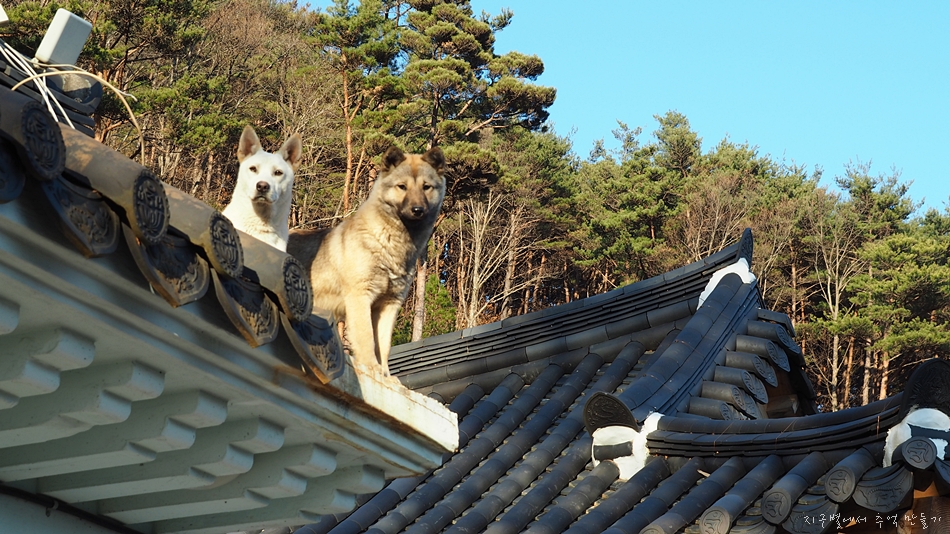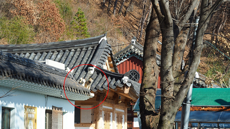금대암 도착하면 가장 먼지 반기는 건 지붕 위에 있는 두 마리의 견 보살.