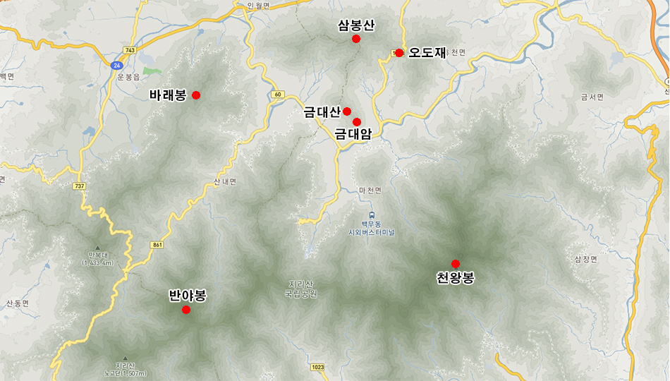 이어서 오도재, 법화산, 황매산, 두류산과 지리 주능이 이어집니다.