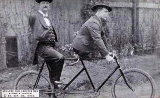 6. 1890년대, 팔이 없는 남자인 Charles B. Tripp과 다리가 없는 남자인 Eli Bowen. 함께 자전거 타기.