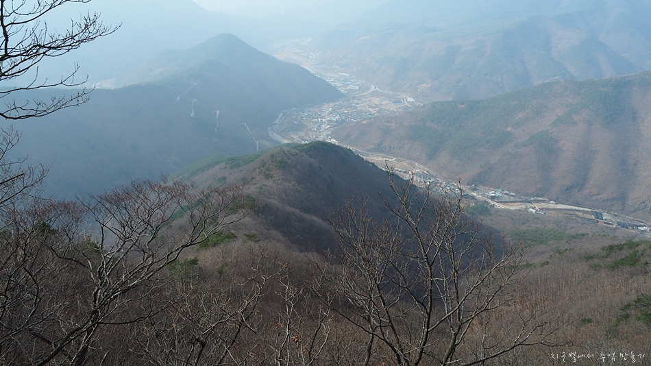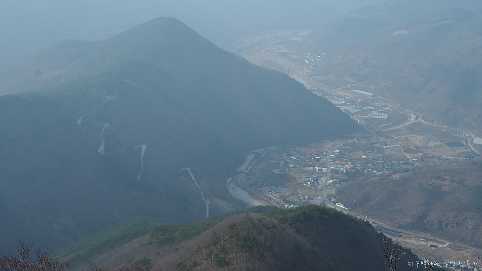 앞쪽이 조금 전 올랐던 백마산이고 좌측 아래 마을처럼 보이는 곳이 밀양에서는 가장 오지 동네라는 가산마을입니다.