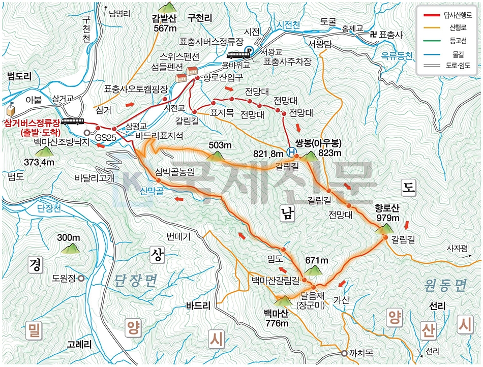 산행 코스 : 삼박골 - 달음재(장군미) - 백마산 - 달음재 - 향로산 - 쌍봉 - 삼박골(원점회귀)