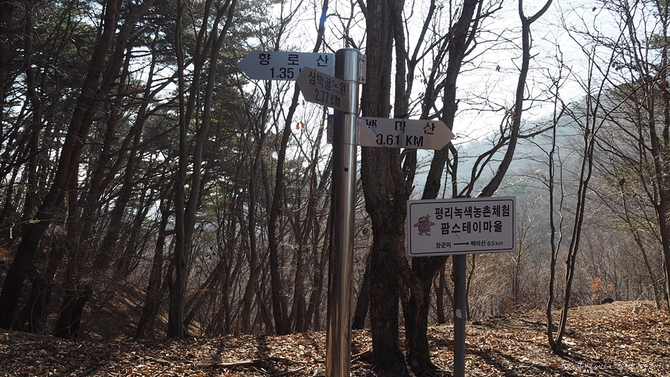 이곳에서 직진하면 섬들펜션 있는 곳으로 곧장 내려가게 되고 다시 20여m 빽하여 오던길 방향 좌측으로 내려가면 삼박골로 원점회귀가 됩니다.