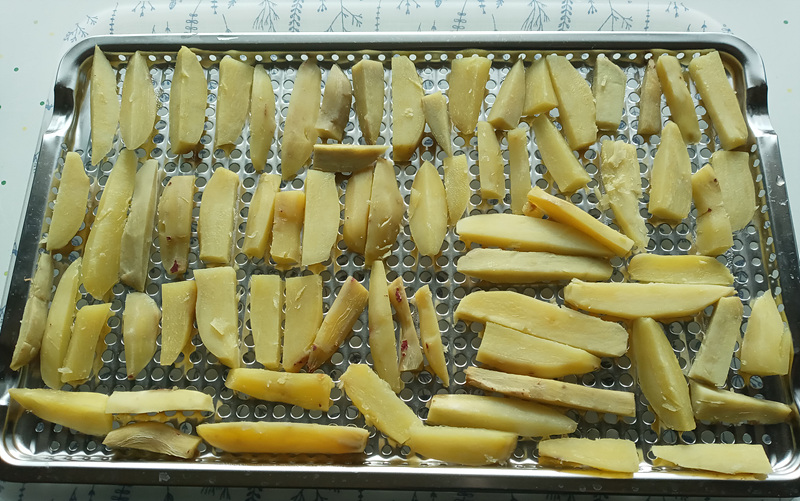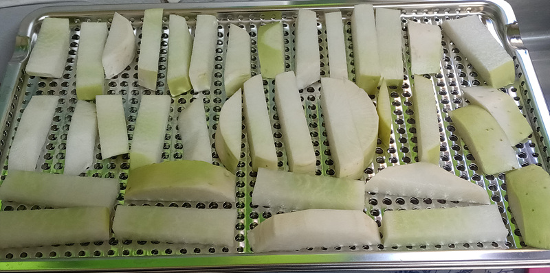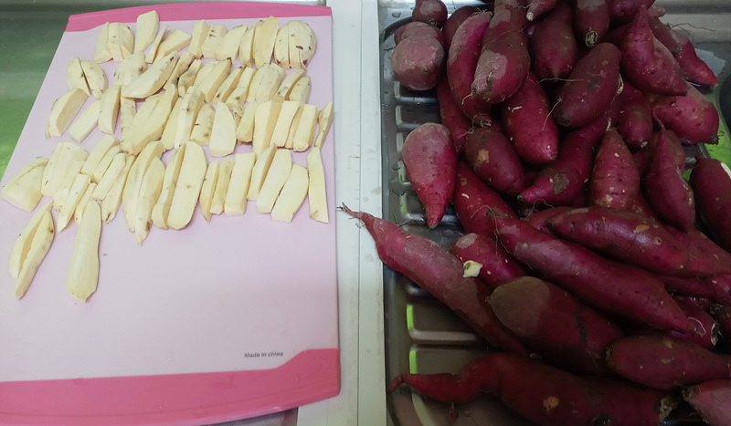 깨끗하게 세척 후 일일이 껍질을 깎고, 먹기 좋은 크기로 썰어서 몇 차례에 걸쳐서 찜기에 쪘습니다