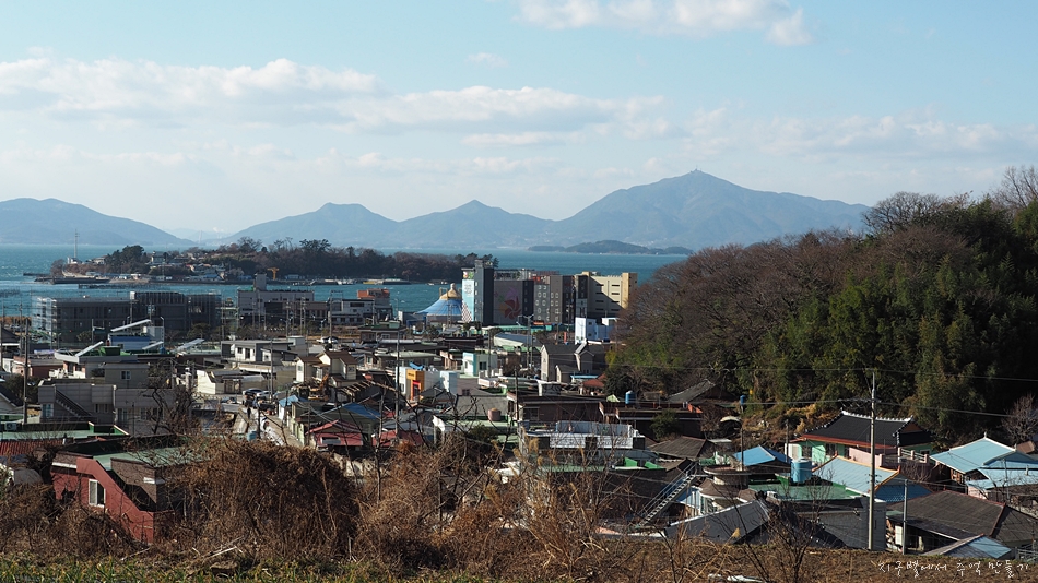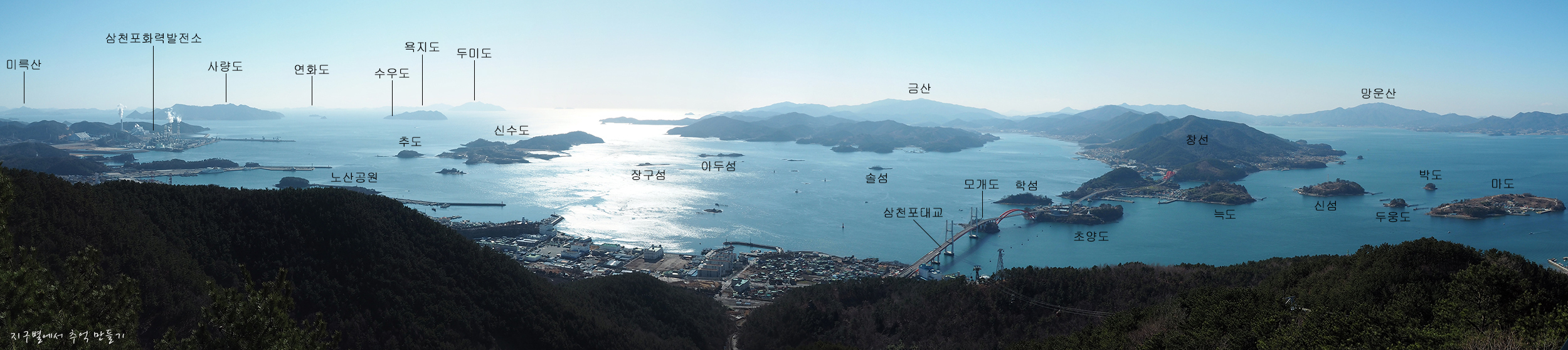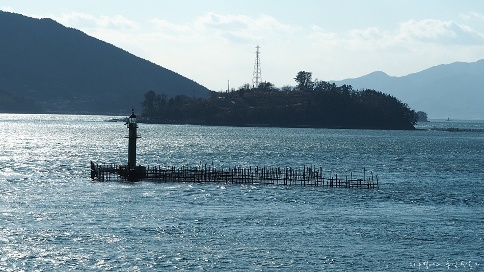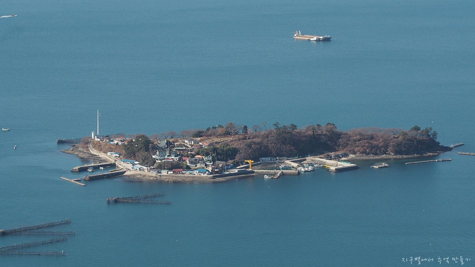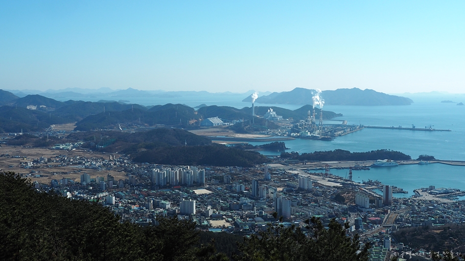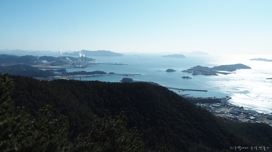 좌측으로 화력발전소가 보이고 그 뒤로 보이는 섬은 사량도.
