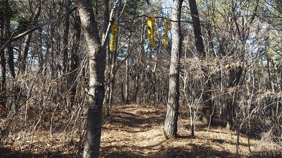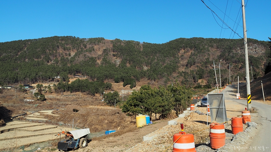 산을 넘어가는 전신주가 있는 곳에서 임도와 만나고 임도 따라 20여m 이동하면,
