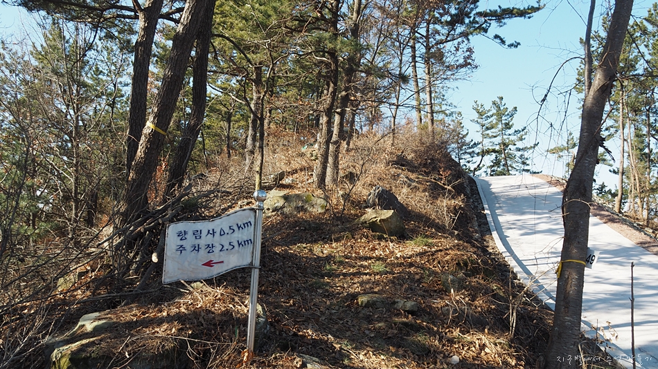 중간에 향림사 주차장으로 내려가는 안내판은 세워져 있으나 길은 보이지 않네요.