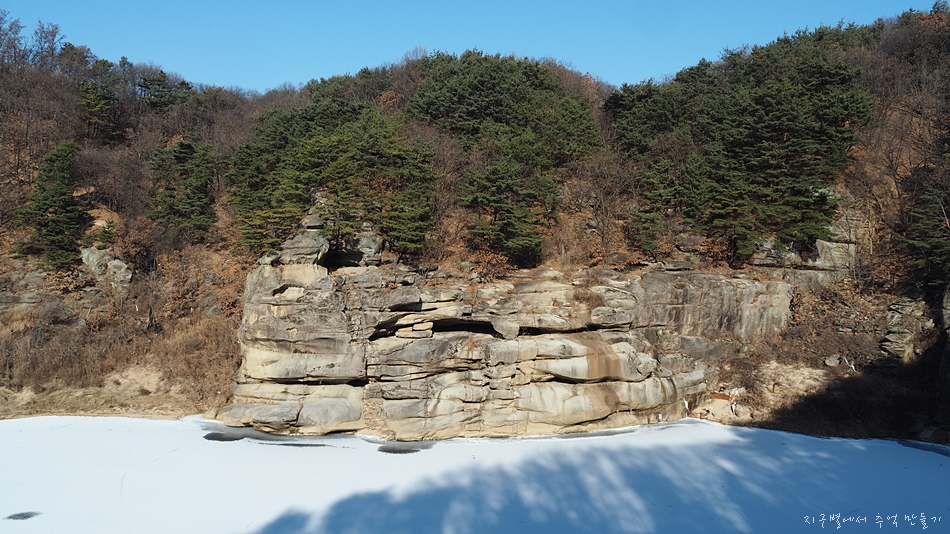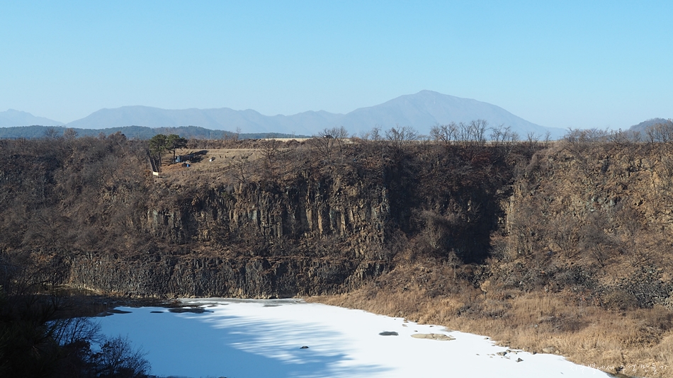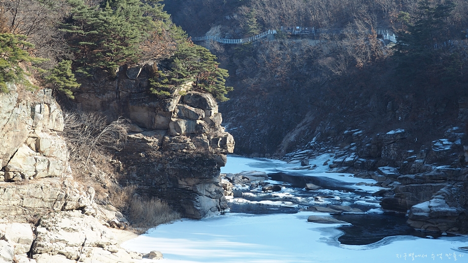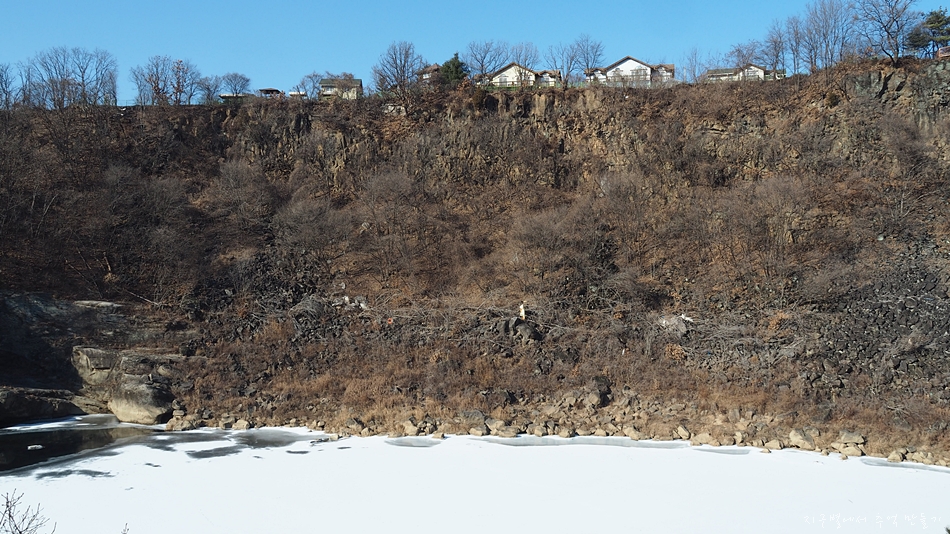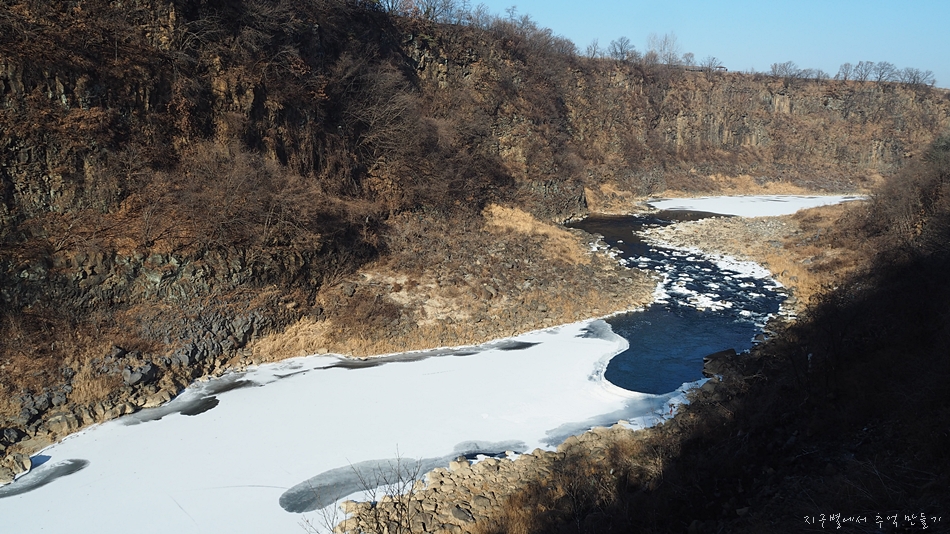 한탄강은 추위에 거의 얼어 있지만 군데군데 차가운 강물이 세차게 흘러가고 있네요.