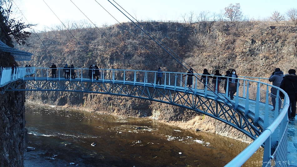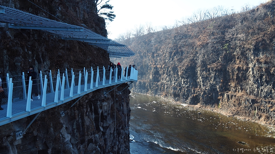 한탄강 121km의 종주길 중 이번에 개통된 주상절리길은 총 연장 3.6km에서 절벽 잔도 구간은 1,400m 정도가 된다고 합니다. 중국 잔도만큼의 아찔한 높이는 아니지만 우리나라 특유의 철골 공법으로 만든 잔도가 아찔함과 스릴감을 느끼게 하여 주네요.