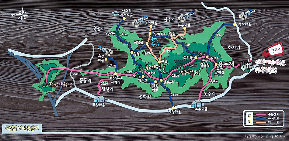 사랑어린학교 앞에 조그만 주차장이 있고 그곳에서 하사리 방향으로 50m 정도 이동하면 도로변에 등산안내지도가 세워져 있습니다. 안내판 화살표 방향으로 산행을 하면 되고 이곳에서 정상까지는 2.2km.