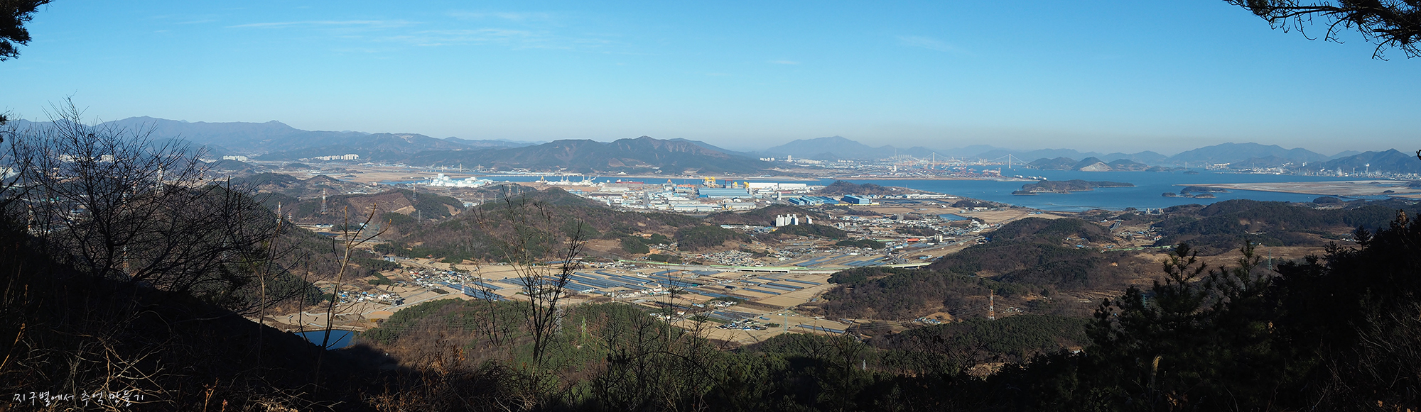 좌측으로 여수 여천산단이 보이고 우측의 산군들은 앵무산에 화양면으로 이어지는 여수지맥.
