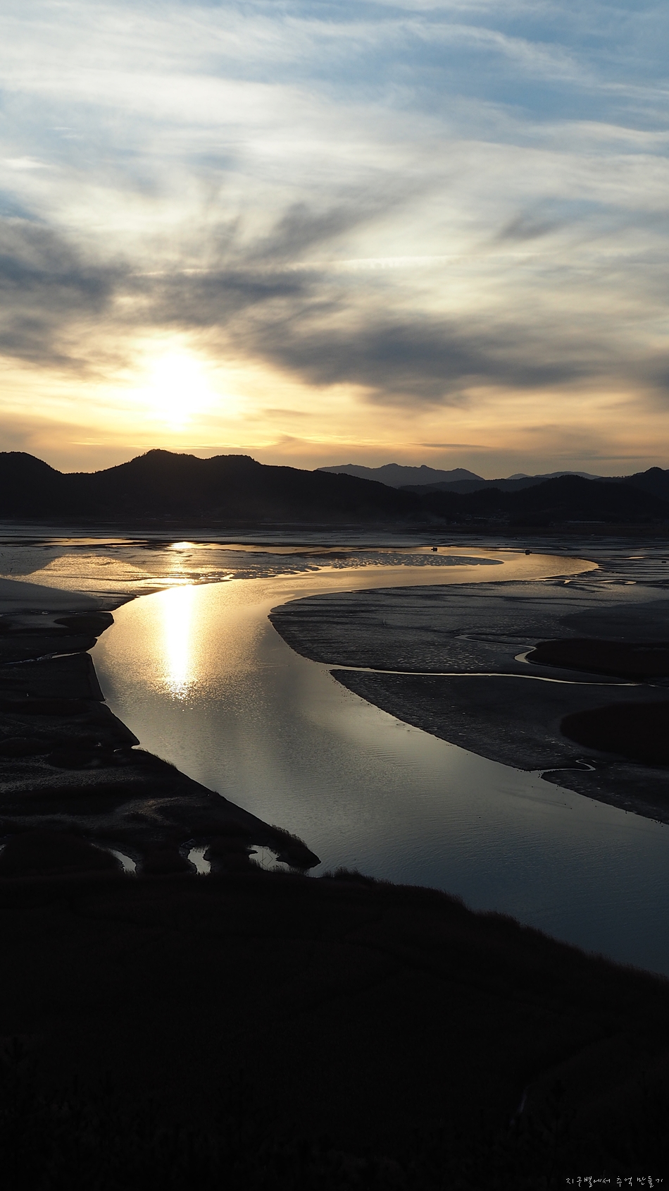우측에 보이는 S라인 물길은 산행 내내, 일몰 내내 같이 합니다.