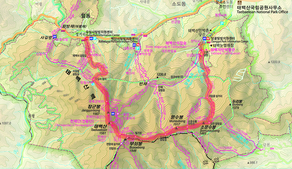 태백산은 높이 1,567m로서 우리나라에서 7번째로 높은 산이지만 올라가기가 쉬워 사철 등산객들로 붐비는 곳입니다.