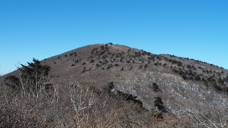 좌측이 연화봉이고 중앙의 하얀 봉우리가 비로봉, 비로봉 우측이 국망봉입니다.