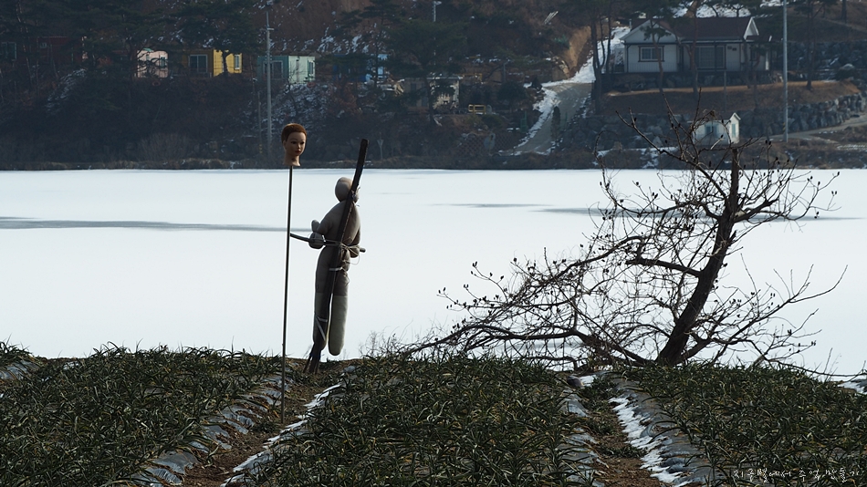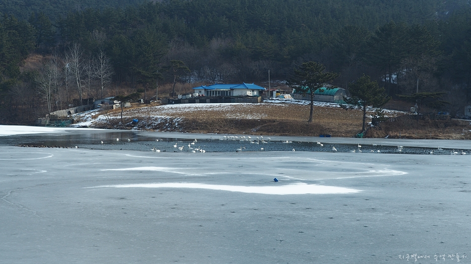 그 앞 저수지가 꽁꽁 얼어 있는데 한쪽이 얼지 않아 철새들의 놀이터가 되어 있습니다.