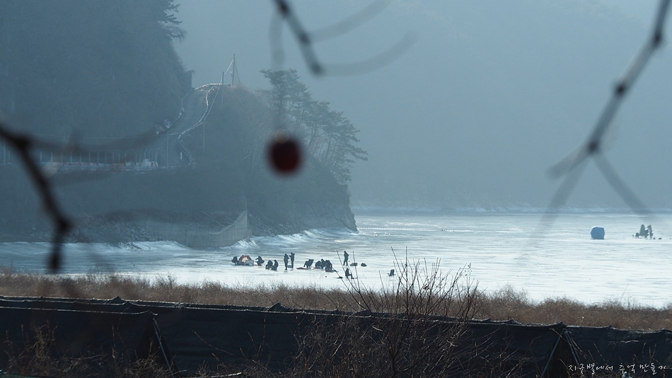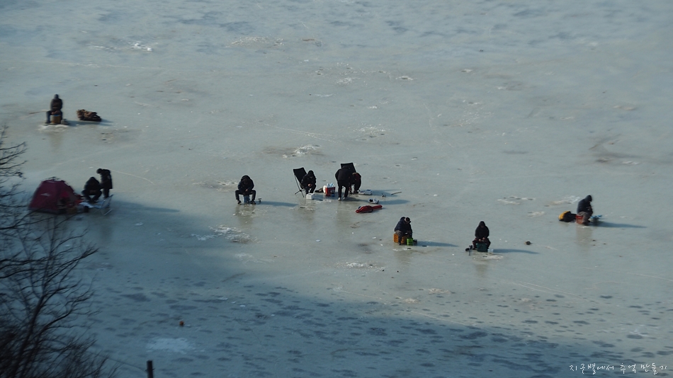 얼음구멍으로 괴기를 건져 올리고 있네요.