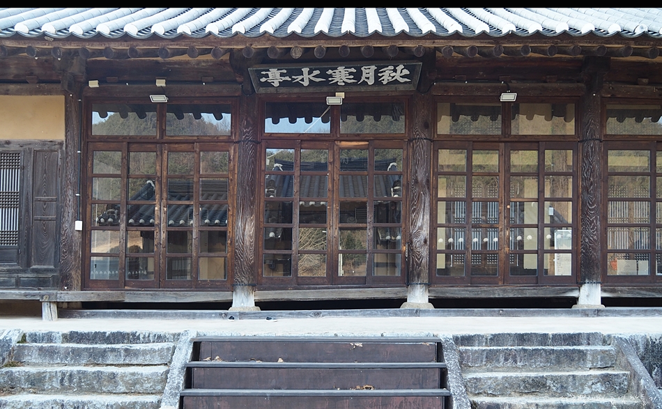 퇴계선생고택이란 현판이 달린 문으로 들어가면 추월한수정(秋月寒水亭)이란 정자를 만나게 되는데 특이하게 고택과 어울리지 않는 유리창으로 되어 있습니다.