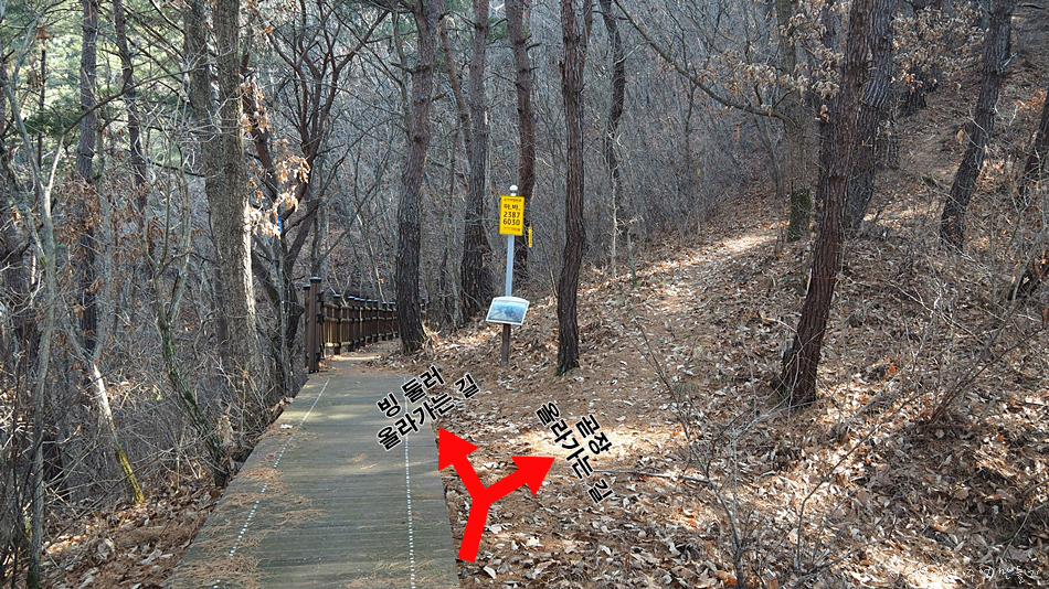 갈선대에서 조금 더 진행하면 양갈래로 길이 갈라지는데 정상으로 바로 오를려면 우측 산길로 가면 되고 선비길을 거쳐 한골까지 갔다가 정상으로 갈려면 좌측 데크길을 따라 가면 됩니다.