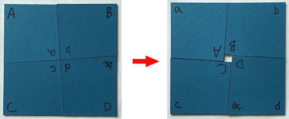 "마쓰야마(Mitsunobu Matsuyama)의 역설"은 정사각형 속에 있는 네 개의 분리된 사변형을 회전시켜 다시 같은 모양의 사변형을 정사각형으로 만들면 중간에 빈 공간이 생기는 것입니다.