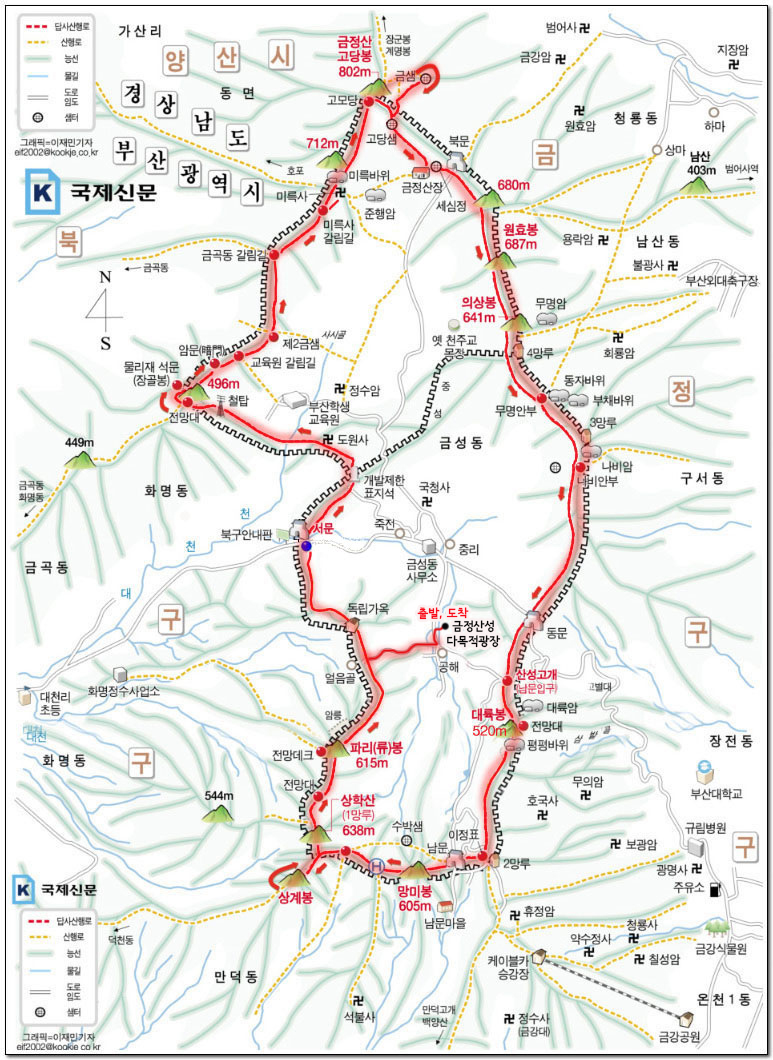 금정산다목적광장 주차장 - 공해마을회관 - 얼음골 언덕 위 - 서문 - 도원사 - 부산학생교육원 - 장골봉 - 2금샘 - 미륵봉 - 고당봉 - 금샘 - 고당샘 - 북문 - 원효봉 - 의상봉 - 4망루 - 3망루 - 동문 - 산성고개 - 대륙봉 - 2망루 - 남문 - 망미봉 - 헬기장 - 1망루 - 상계봉(갔다 왔다) - 파리봉 - 얼음골 언덕 위 - 광장 주차장(원점회귀)