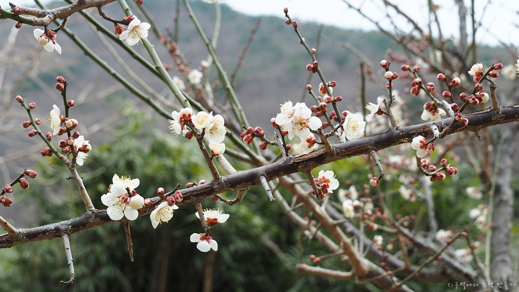 암자 아래 밭 귀퉁이, 매화가 막 피고 있습니다.