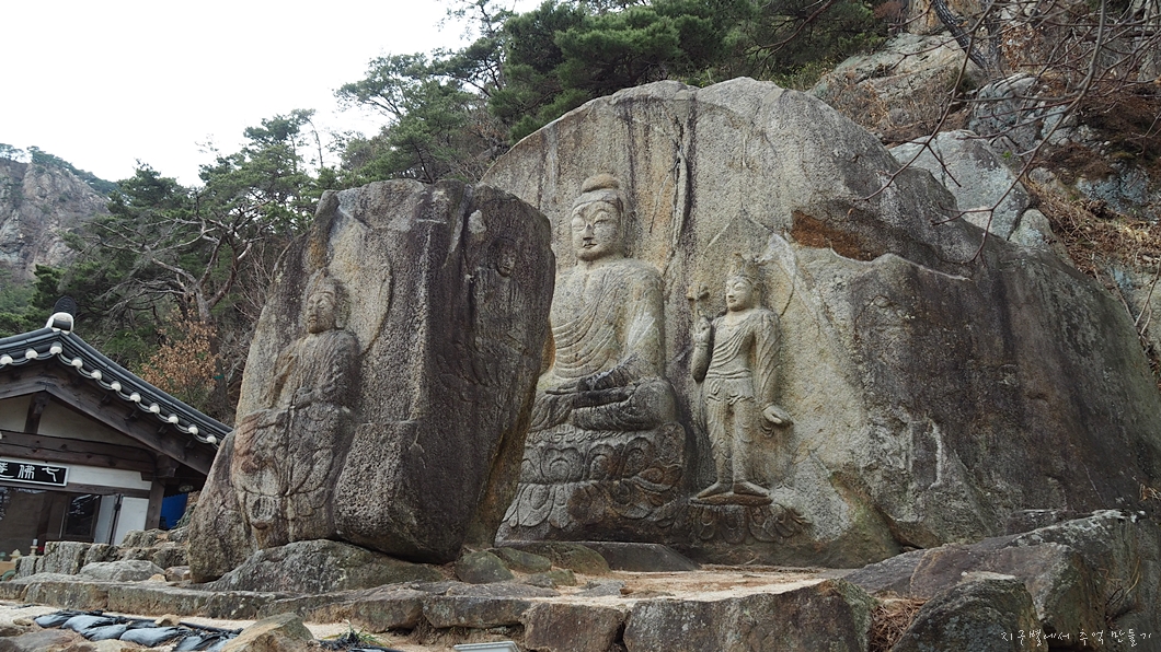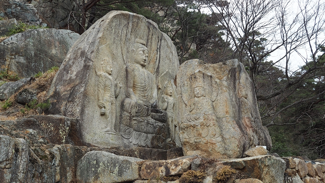 앞쪽 작은 바위 네곳 면에 한분씩 새겨져 있고 뒷편에 삼존불이 새겨져 있습니다.