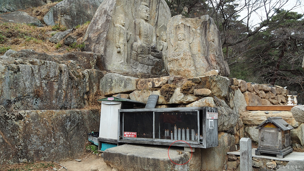 이곳 저곳 부처님 자락을 온통 헤집고 다니네요. (빨강 원 안)