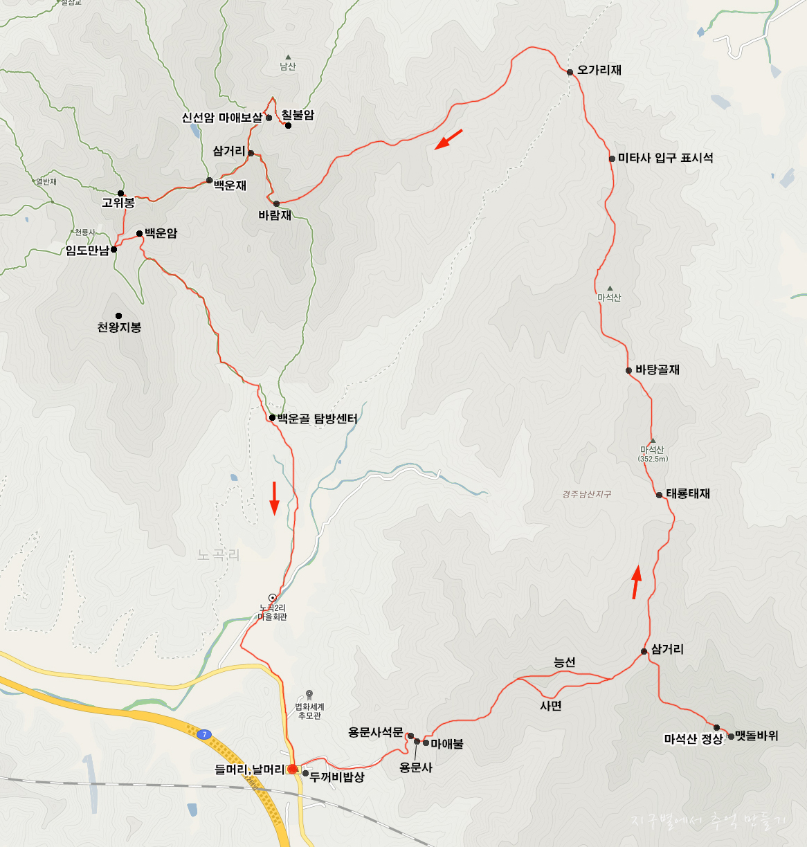 인근 남산국립공원 구간과 연계하여 제법 먼 거리를 걷는 코스로 잡았답니다.