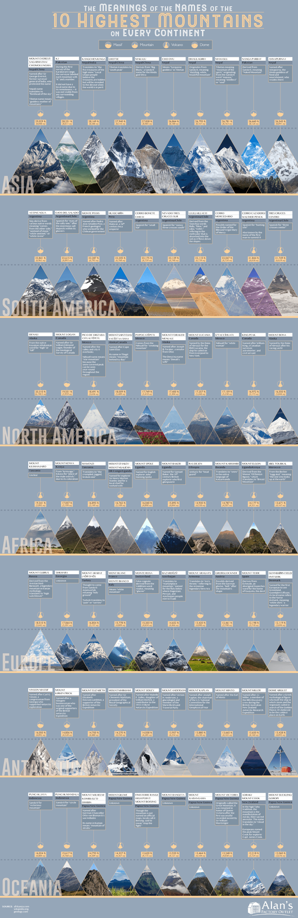 각 대륙에서 가장 높은 산 10개와 이름의 의미.