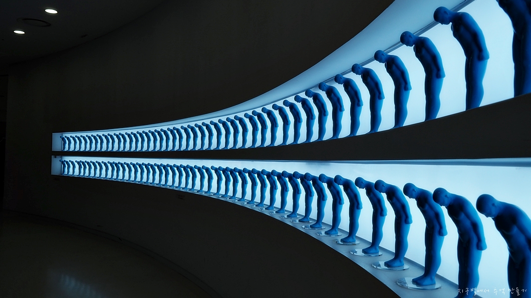 예술가 유영호씨가 디자인한 것으로 굽어져 있는 복도형 전시관을 따라 인사를 하는 사람 모형 1000개가 설치되어 있습니다.