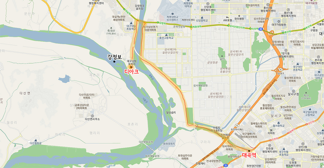 이곳에서 출발하여 진천천을 따라 걸은 다음 낙동강을 끼고 디아크가 있는 강정보까지 왕복하는 구간입니다.