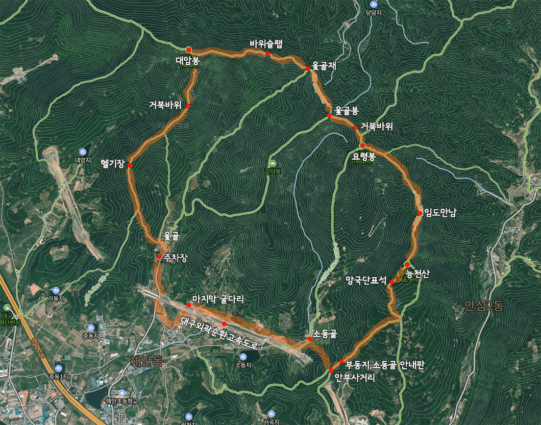 옻골주차장 - 거북바위 - 대암봉 - 옻골재 - 옻골봉 - 요령봉 - 능천산 - 소동골 - 대구순환고속도로 옆길 따라 - 마지막 굴다리 통과 - 옻골 주차장(원점회귀)