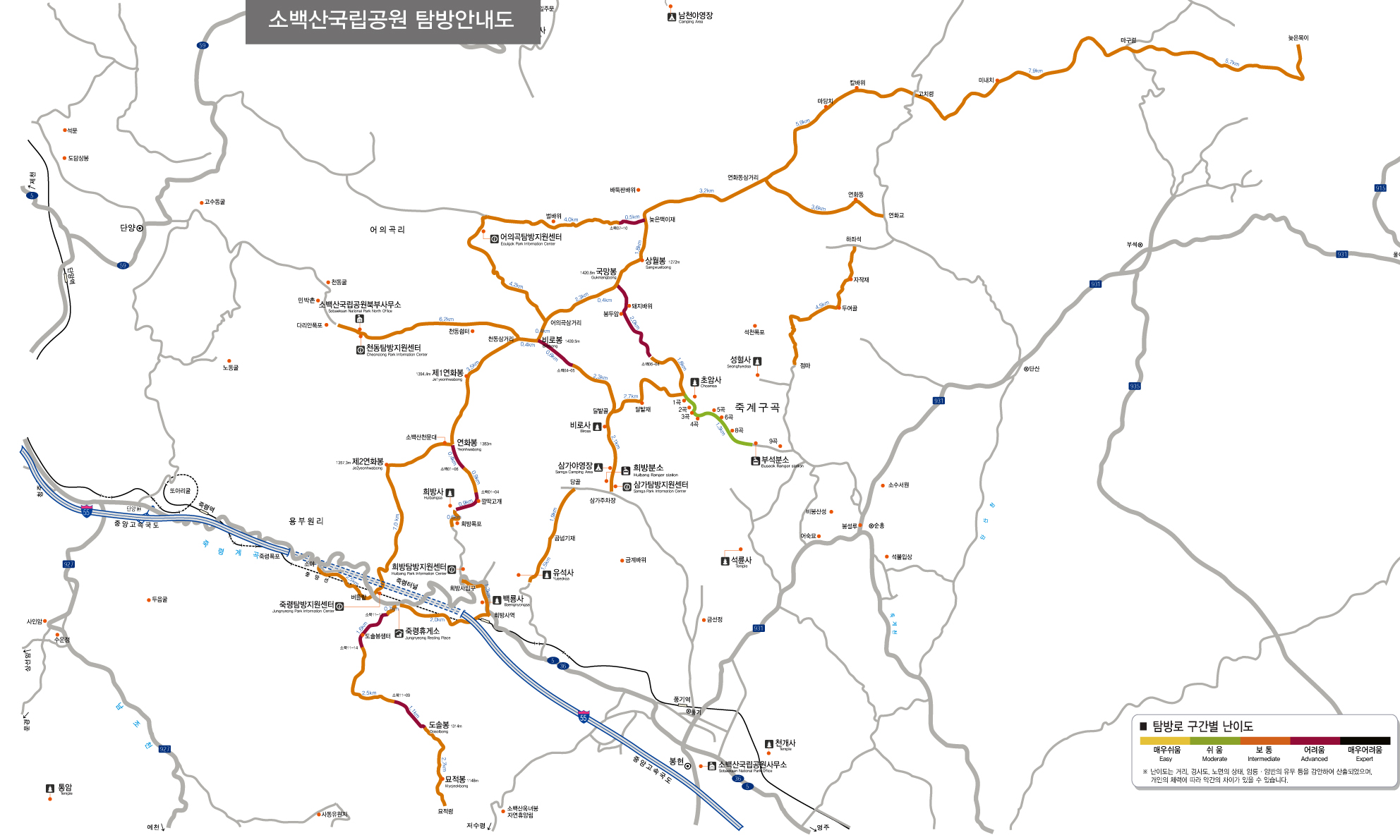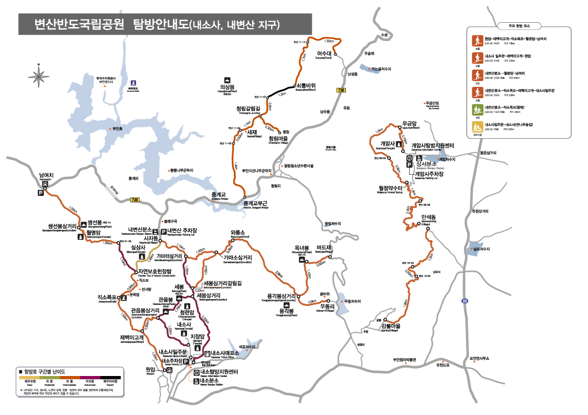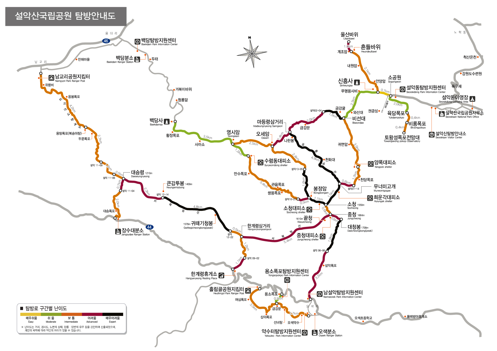 옅은 노란색이 가장 쉬운 구간이고 검은색으로 갈수록 힘든 탐방로이구요.