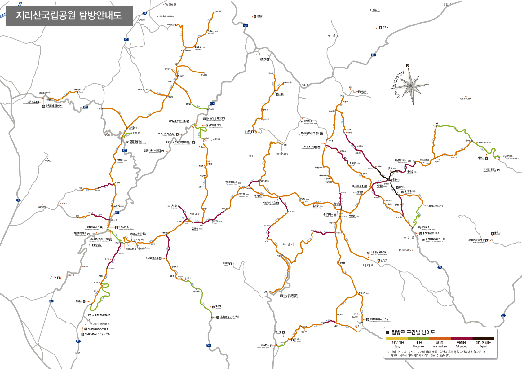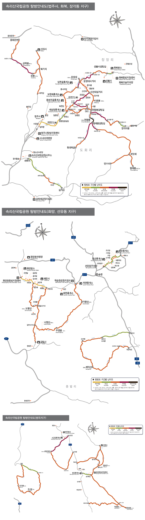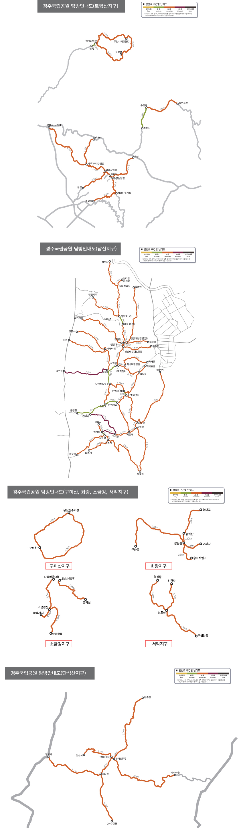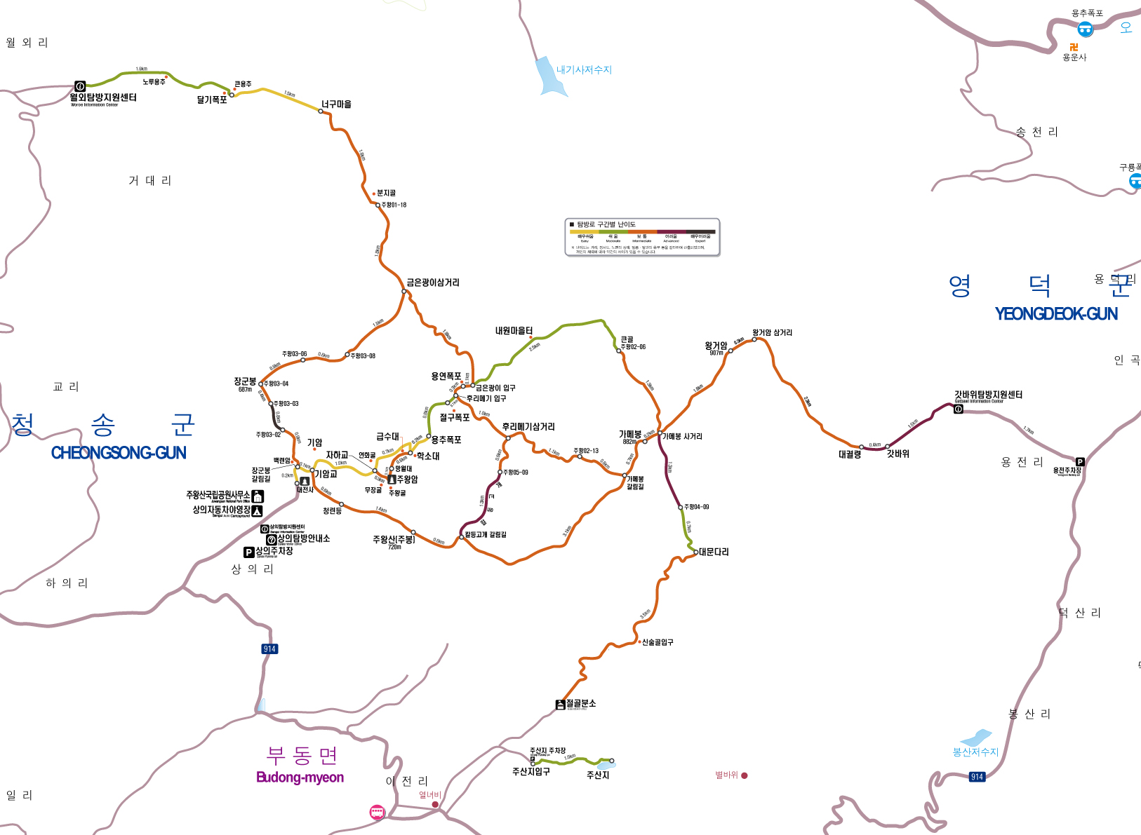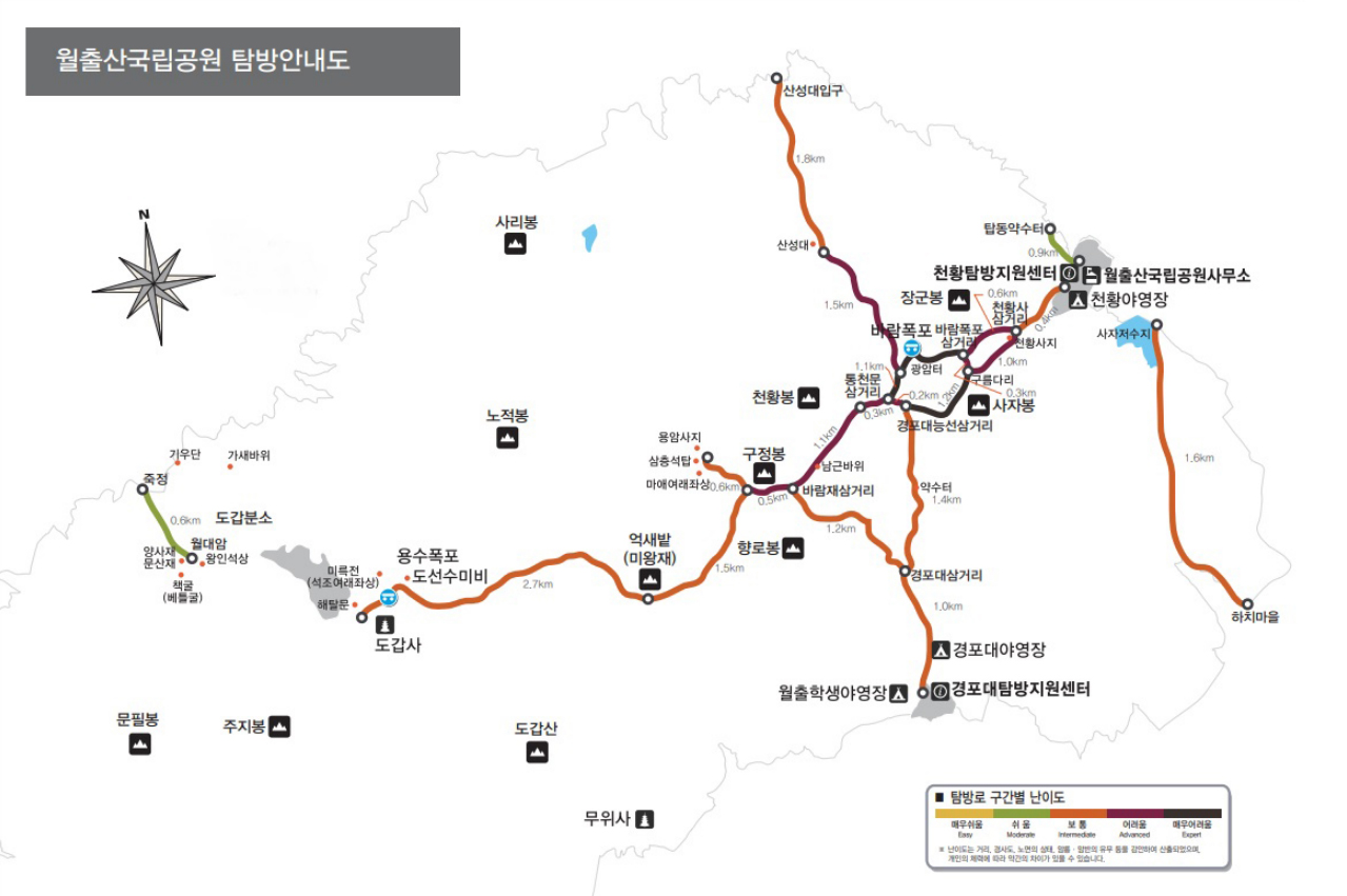 공식 탐방로에는 색깔별로 난이도가 표시되어 있습니다.