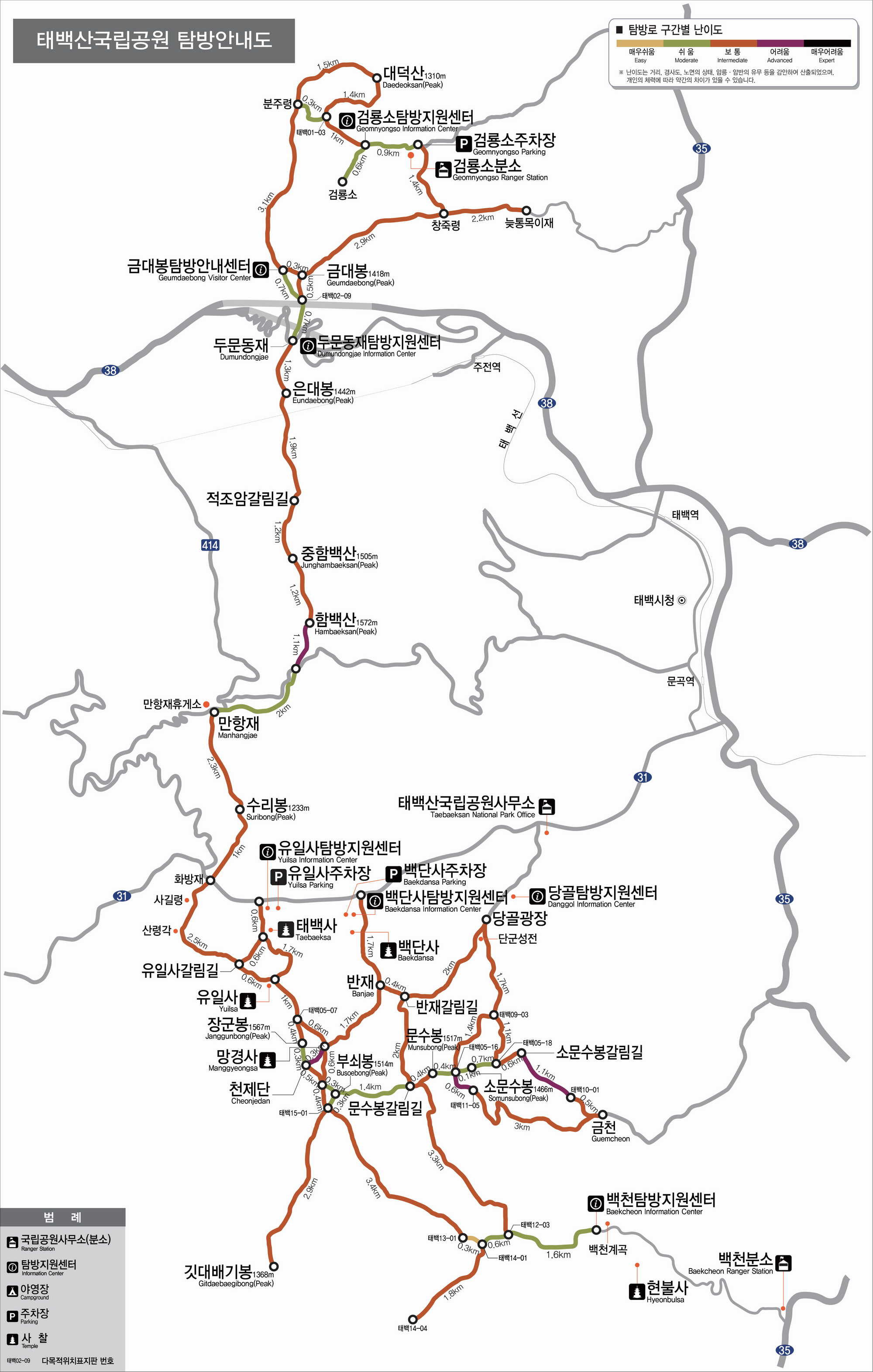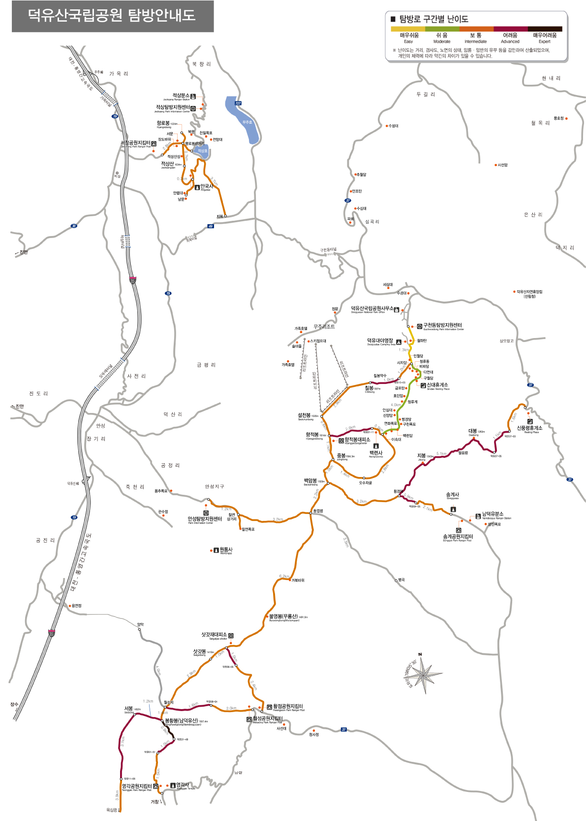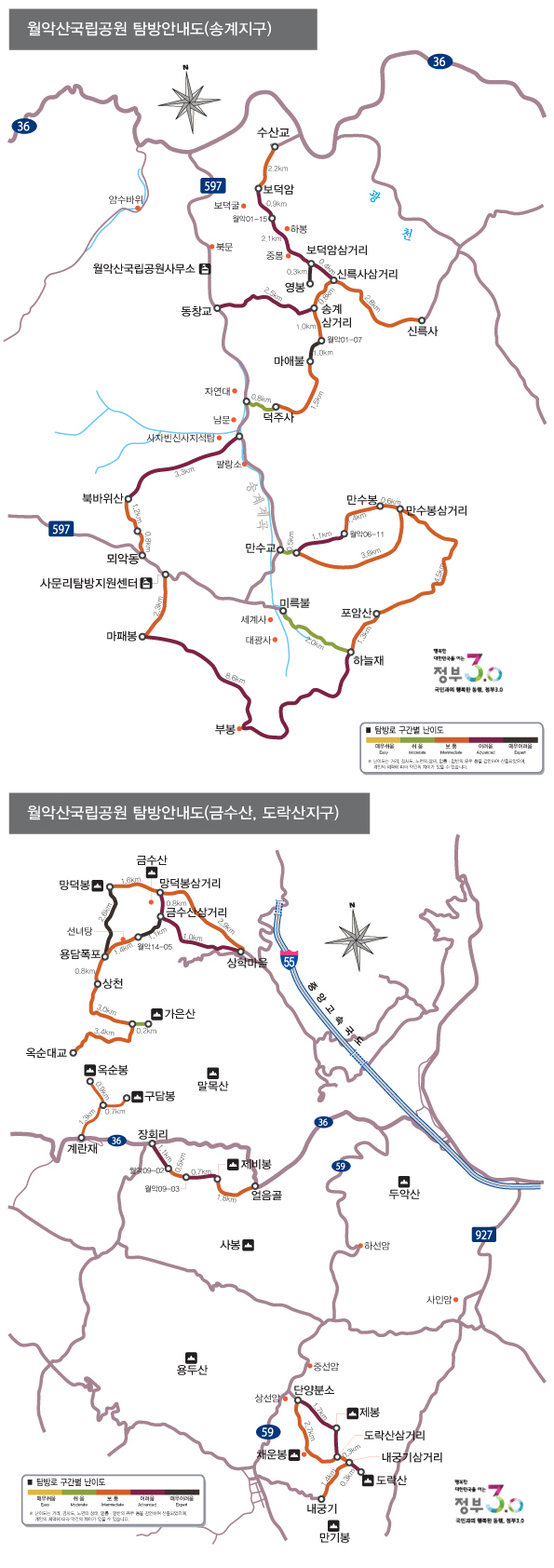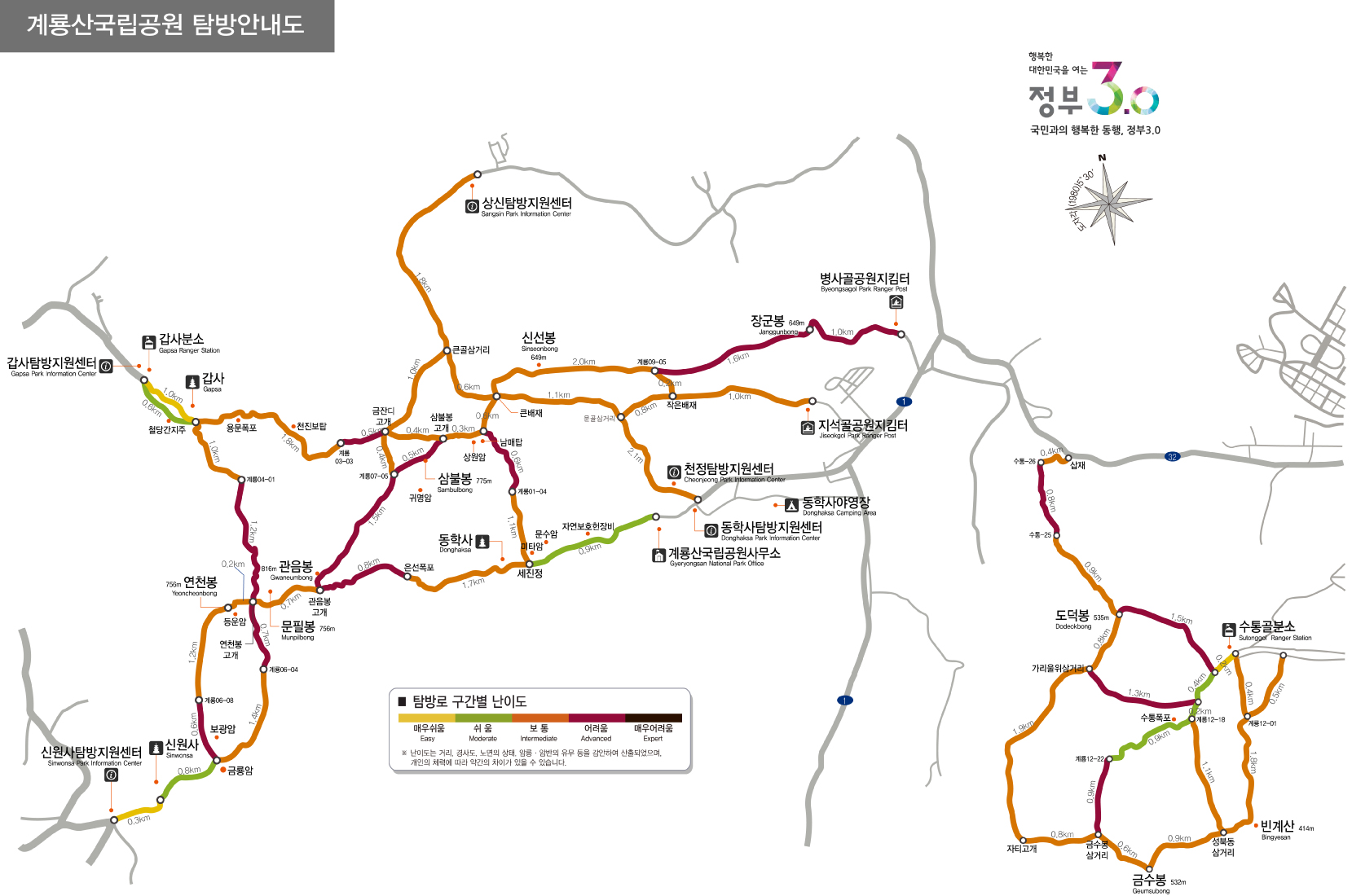 공식 탐방로에는 색깔별로 난이도가 표시되어 있습니다.