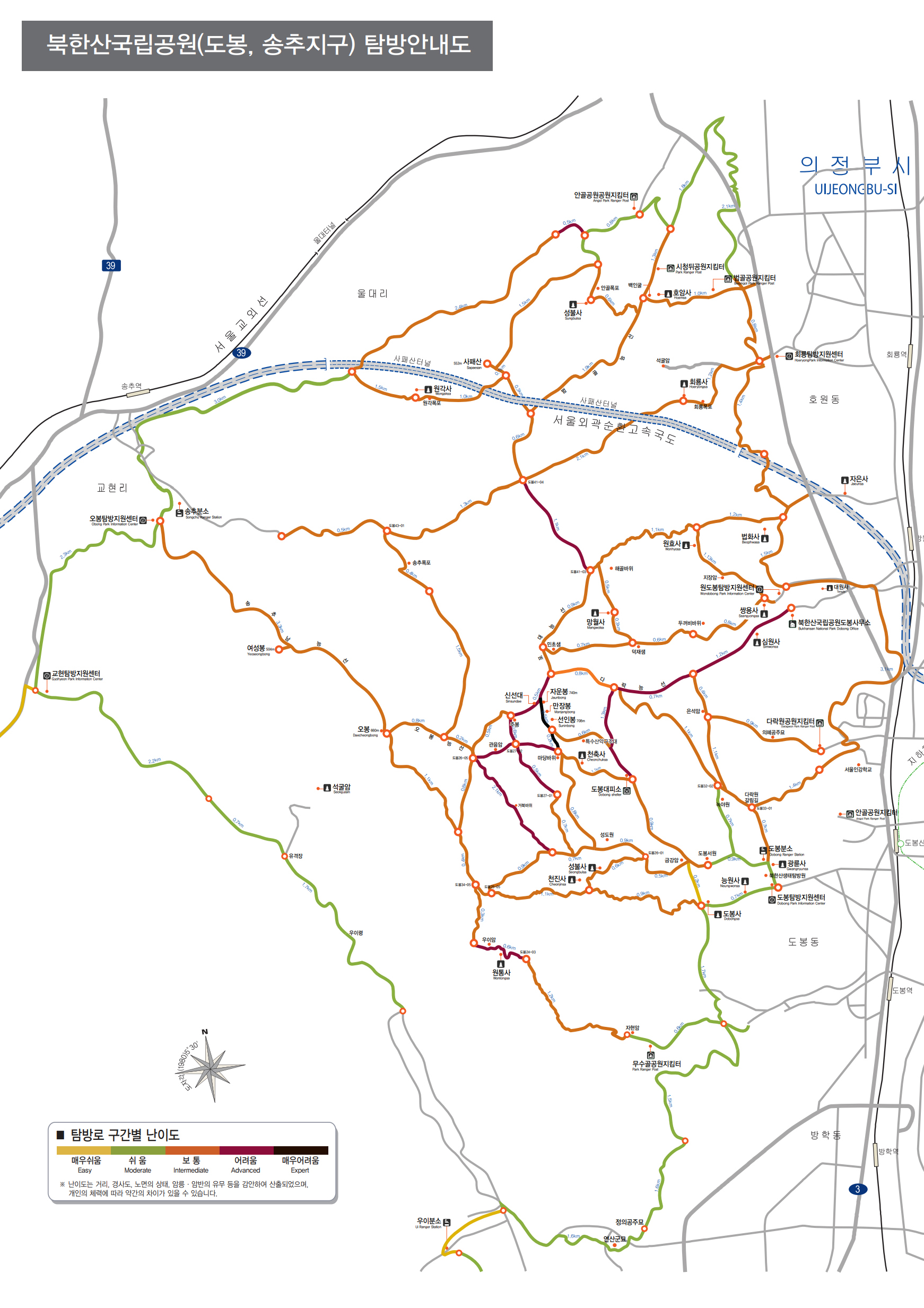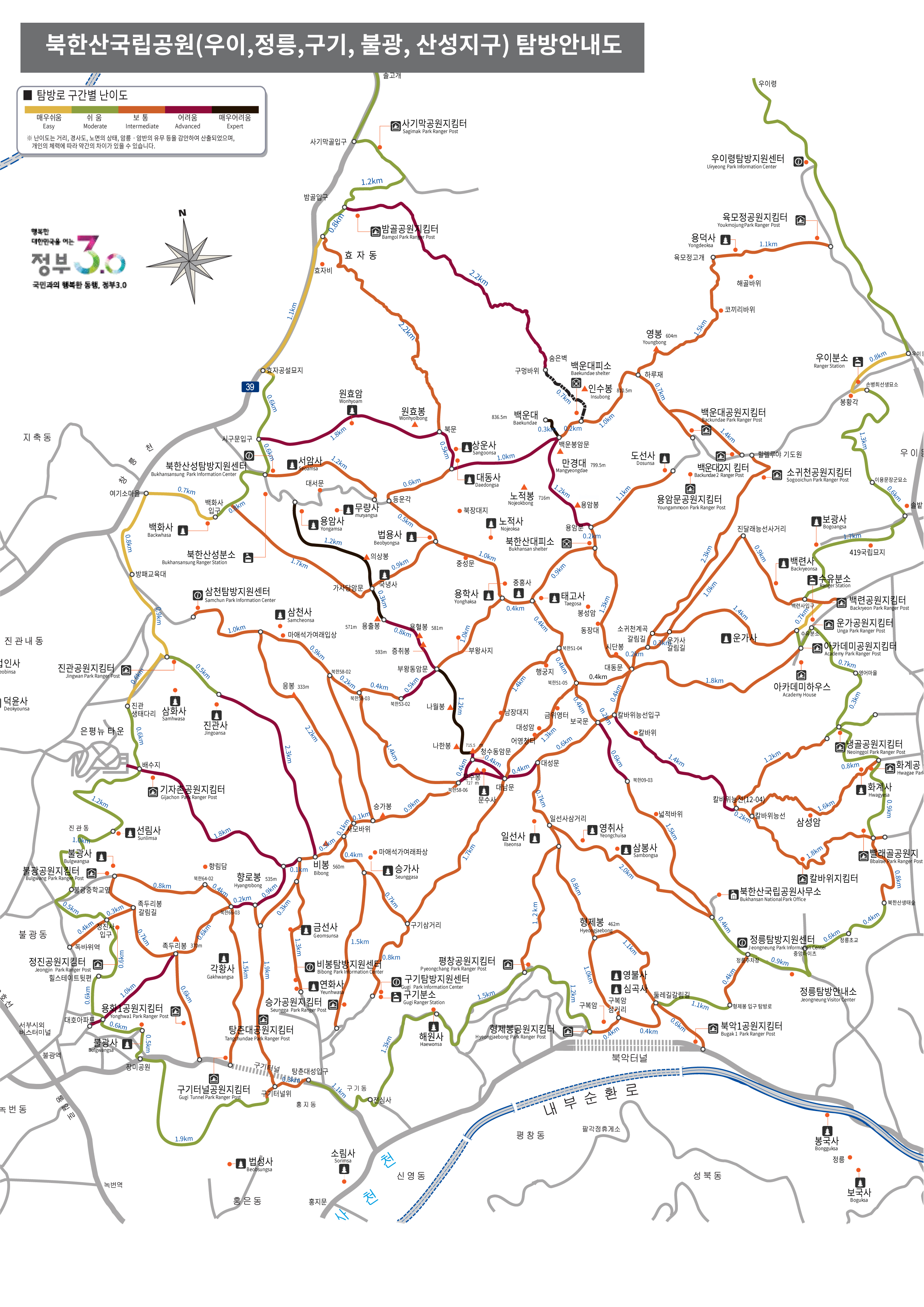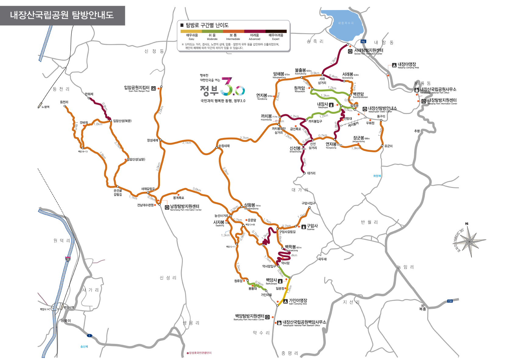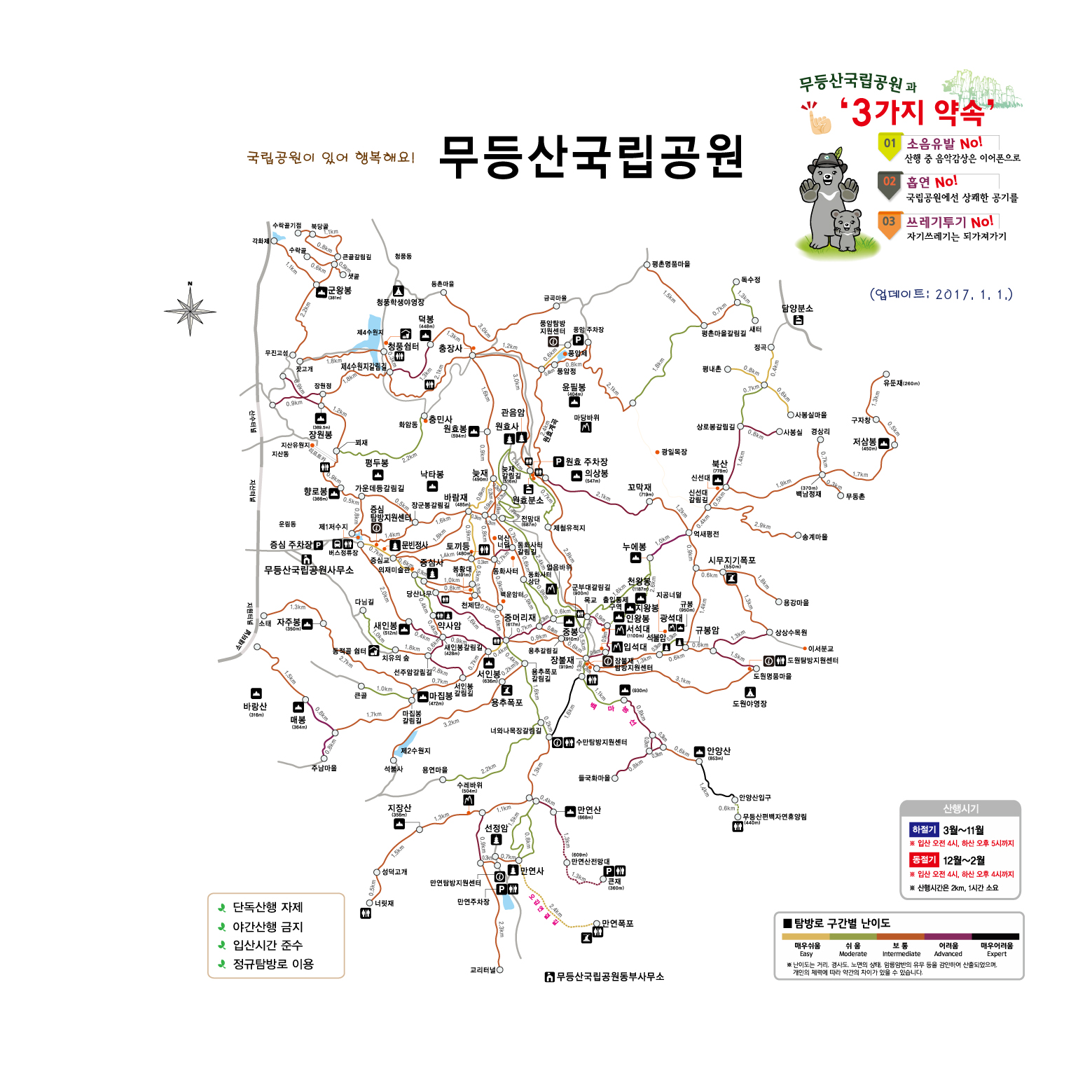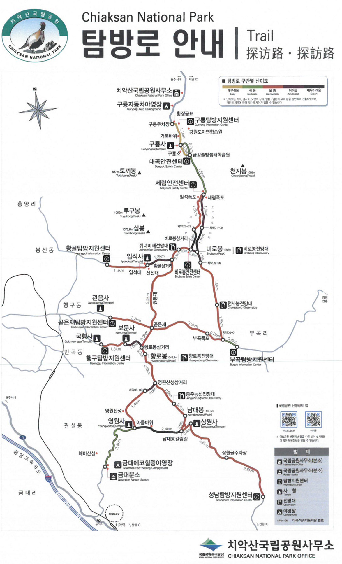공식 탐방로에는 색깔별로 난이도가 표시되어 있습니다.
